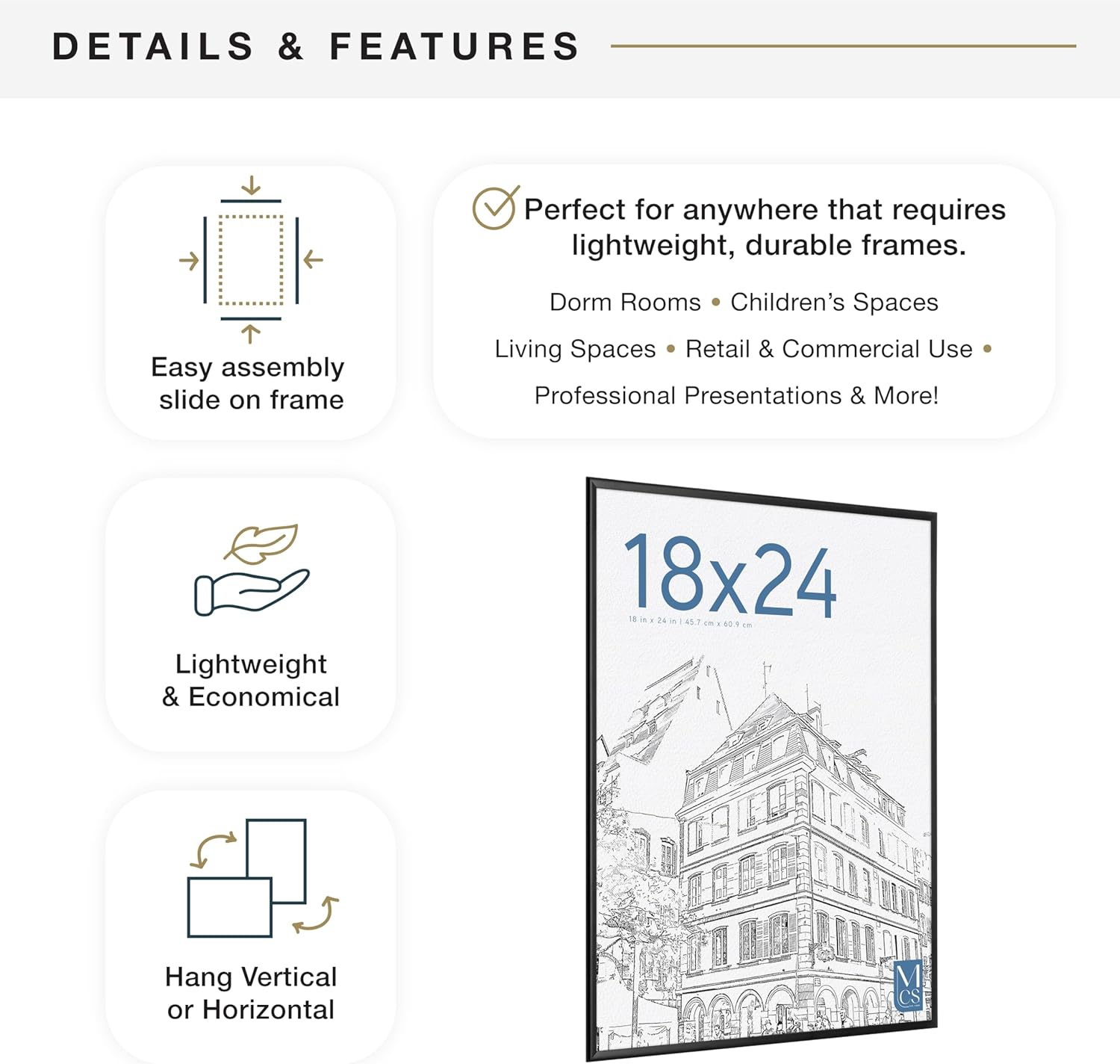 MCS Original Poster Frame 18x24 Black Lightweight Vertical & Horizontal Wall Hanging Large Picture Frame for Posters, Art Prints & Gallery Wall (2-Pack)