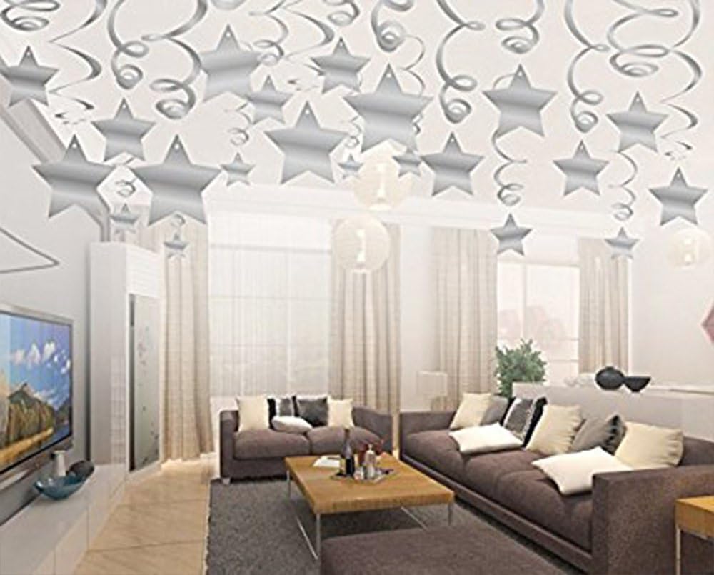 - Package includes 30 Hanging Swirl Decorations total with 15 Silver swirls measuring 20in long and 15 swirls with PVC Star measuring 24in long