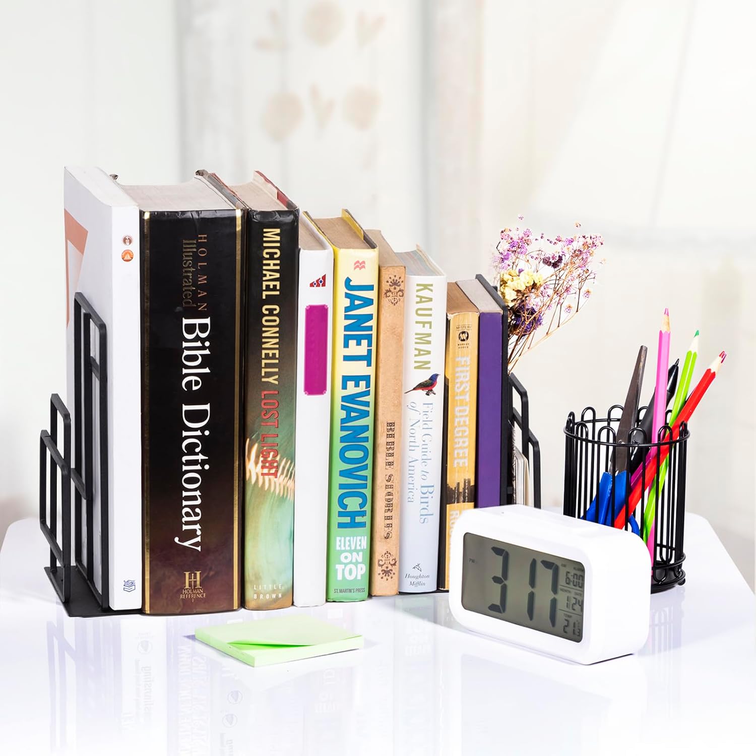 - Window Lattice Design: Unique book ends displaying an elegant beauty will definitely highlight your books. Hollw-out design allows you to maximize the space to store your memo and ruler, or add some decorations like dried flowers.