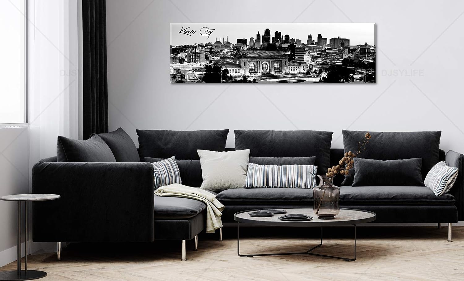 Pictures for Bedroom Black and White Wall Art Kansas City Panoramic Cityscape Skyline Canvas Art Prints for Living Room Office Home Decor Framed and Ready to Hang 13.8"x47.3"