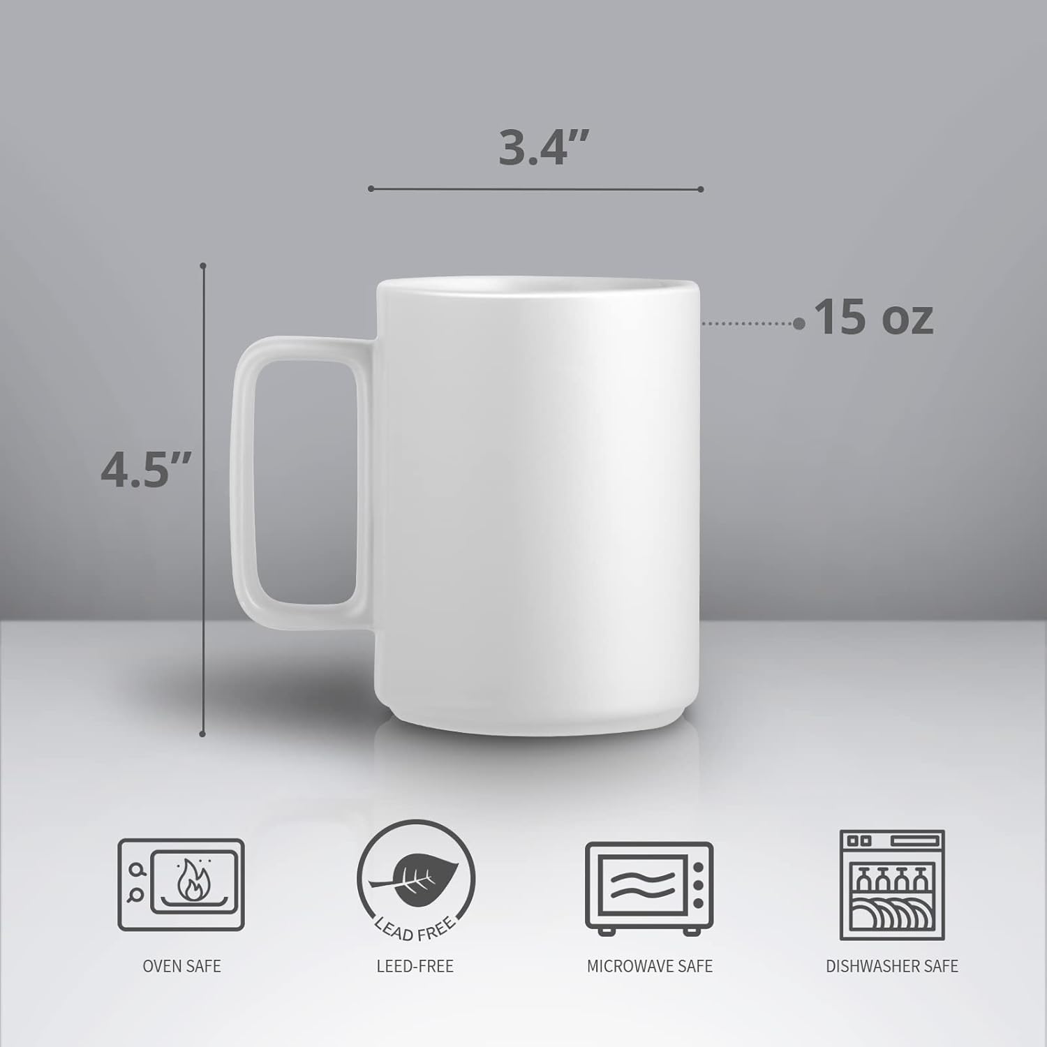 - SIMPLE, COMFORTABLE DESIGN: The Clean-lined Design in white porcelain is ideal for everyday enjoyment of your favorite hot pick-me-up. 15 Ounces capacity is perfect for tea, coffee or hot chocolate