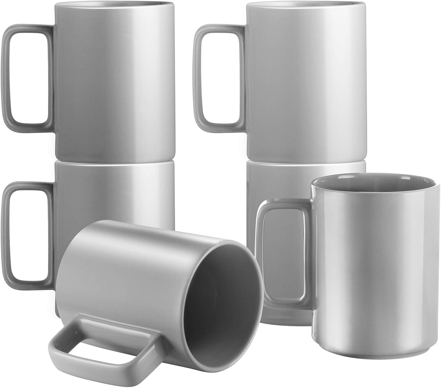 E-liu Porcelain Tea Mugs Coffee Mug Set, Large 15 Ounces Cups for Coffee, Tea, Cocoa, and Mulled Drinks, Set of 6, Grey