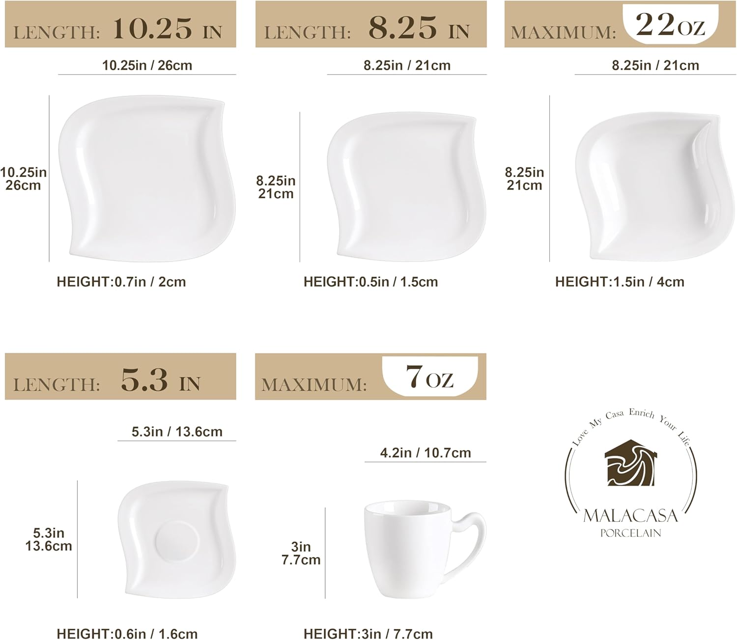 - What Dinnerware You Will Get -- MALACASA dinnerware sets for 6 includes 10.25'' dinner plates, 8.25'' dessert plates, 22 OZ soup bowls, 7 OZ cups & 5.3'' saucers. The leaf-shaped design makes this dinnerware set creative and stunning, perfect fit for all casual or formal occasions.