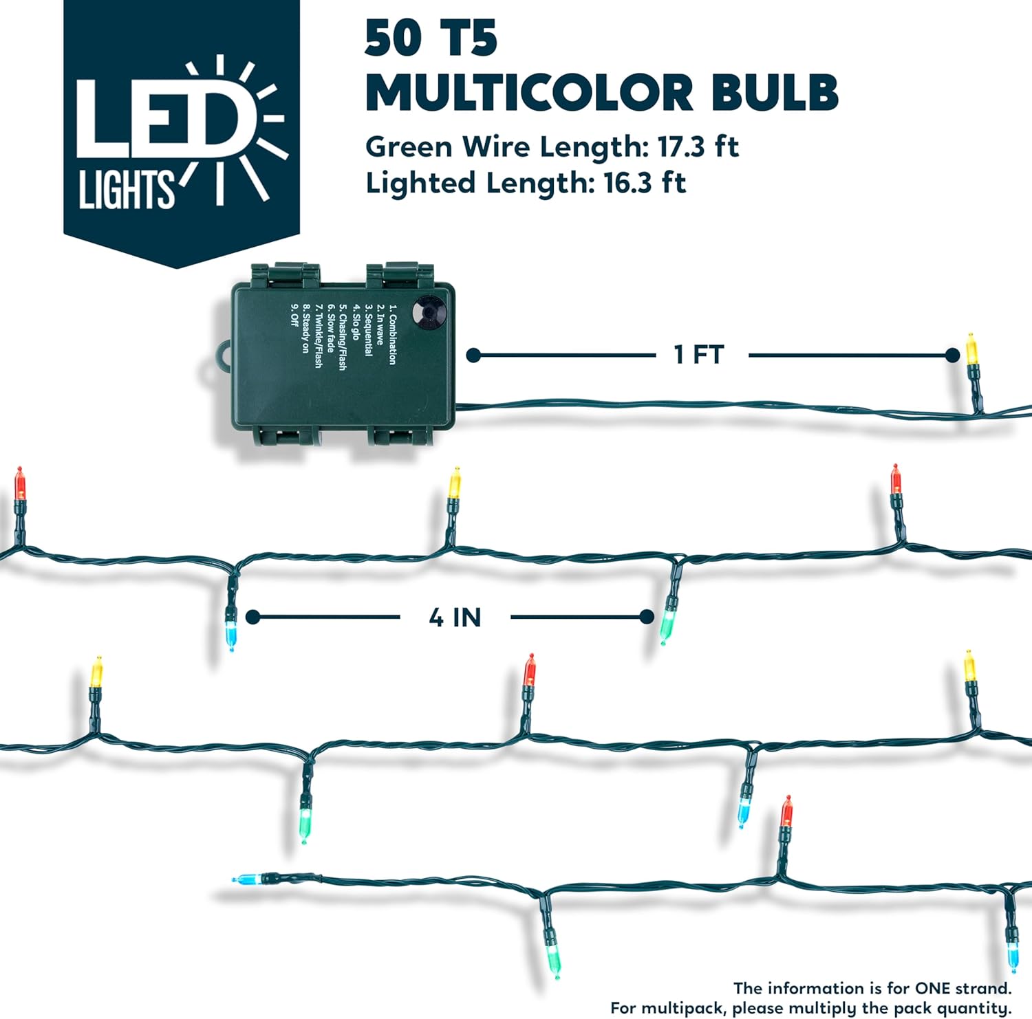 - SUPER VALUE. This battery powered Christmas string light has 50 counts of Multicolor LED bulbs and measures at 17.3ft. Each set has 17.3 feet wire length and 16.3 ft lighted length.with 4 inch light spacing.Its individual size is 3mm*16mm.