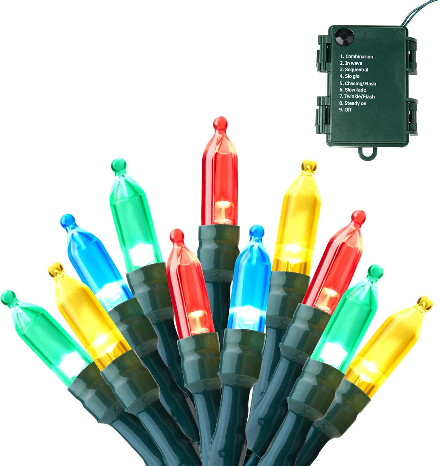 - EASY TO OPERATE. This product does not include a remote control.The string lights could change the lighting modes (Combination, In waves, Sequential, Slow Glow, Chasing/Flash, Slow fade, Twinkle/Flash, Steady on) by hitting the button in the battery box.