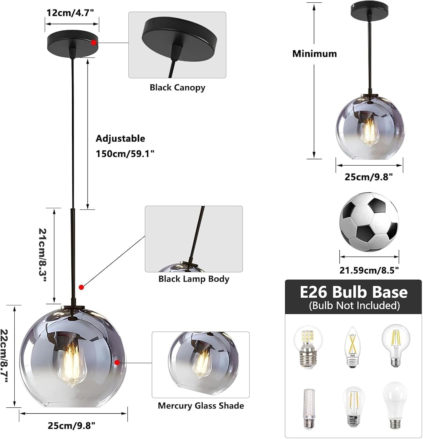 - Black Glass Pendant Light Size: The mercury glass ceiling light globe diameter: 9.8ā(25cm), canopy: 4.7ā(12cm). Light source: E26 (Bulb not included)(bulb replacement ASIN: B081WVNCVM), voltage: 110-220V for worldwide. The glass globe pendant light can be dimmable when work with dimmable bulb and switch