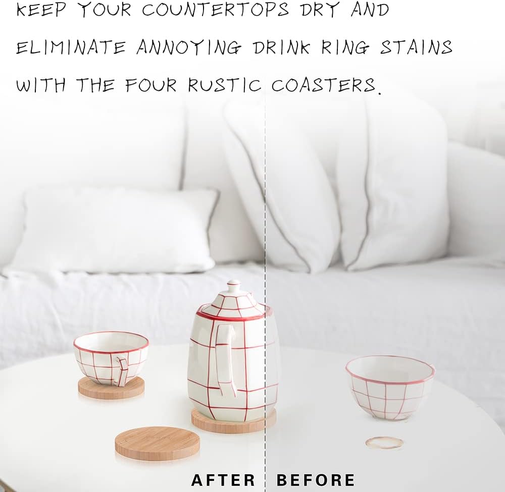 - 【4-COASTERS INCLUDED & RIGHT SPACE】15.78inch dia circular tray; there is ample space to store various items. Plus, carrying multiple items from the kitchen to the living room is a breeze. Keep your countertops dry and eliminate dreaded drink ring stains with the four gorgeous rustic wooden coasters.