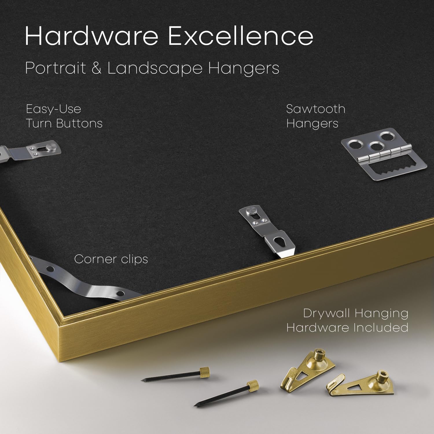 Homeforia 11x14 Picture Frame Gold, High End Metal 11x14 Poster Frames with Mat for 8x10, 11 x 14 Gold Frame Matted to 8 x 10 inch Photo, 11by14 Thin Hanging Frames, Tempered Glass, Wall Kit, Set of 1