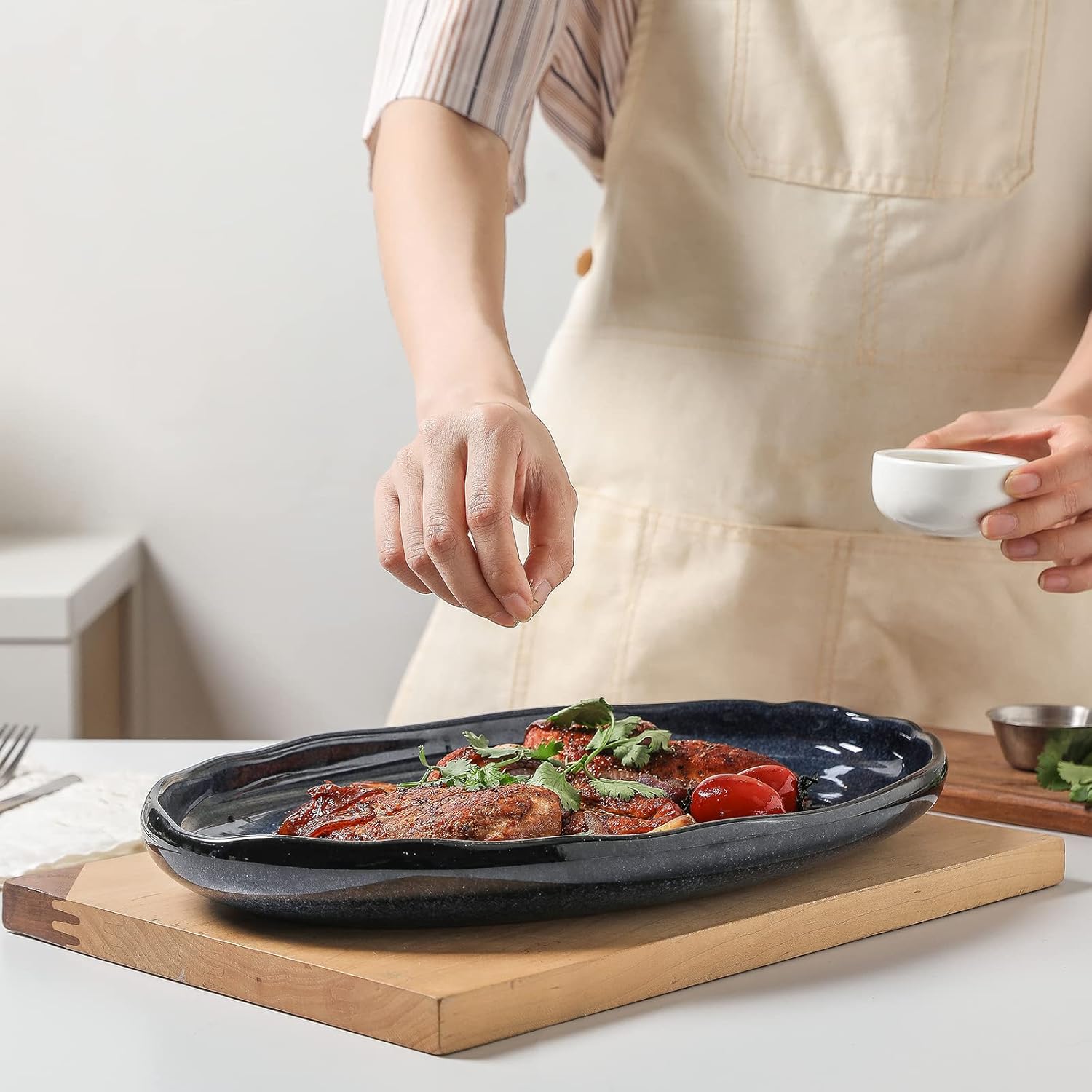 - MICROWAVE OVEN PROOF: These serving trays are made of durable porcelain, chip-resistant and more sturdy than stoneware, oven safe to 590°F, and the oval ceramic serving grill platter be used in the oven, microwave, refrigerator and dishwasher