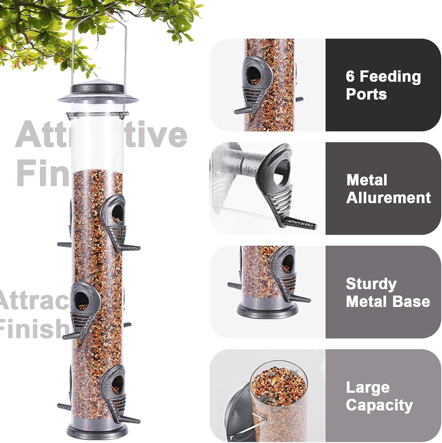 - Attractive design bird feeder: Our bird feeders have 6 perches, allowing multiple birds to eat at the same time in bird feeders for outside.The hard tube transparent shell of squirrel proof bird feeders is thick 1.4mm, durable and chew-resistant