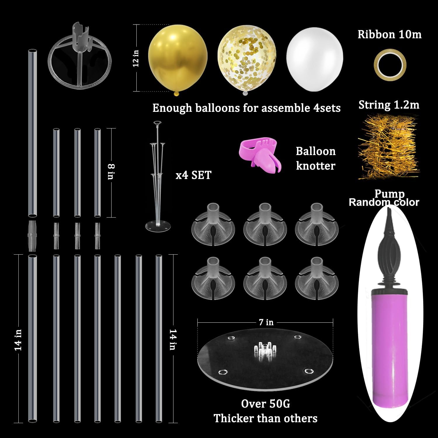 - WHAT INLCUDE: This balloon stand kit include 4 set balloon holders, 35pcs balloons - gold and confetti balloons, white balloons, balloon pump, balloon clips, ribbons, glue dots and tie tool