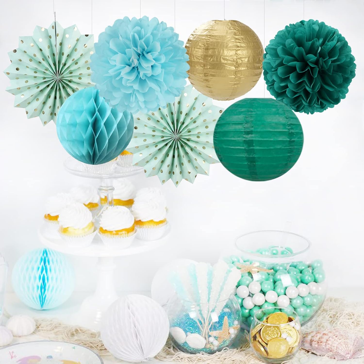 - ăPackage ContainsăThe sage green teal blue gold party kits include 6pcs tissue paper flowers: 3pcs 10" and 3pcs 12" in three color, 4pcs 8inch paper honeycom ball,2pcs 8inch paper lantern, 2pcs 12inch paper fan.