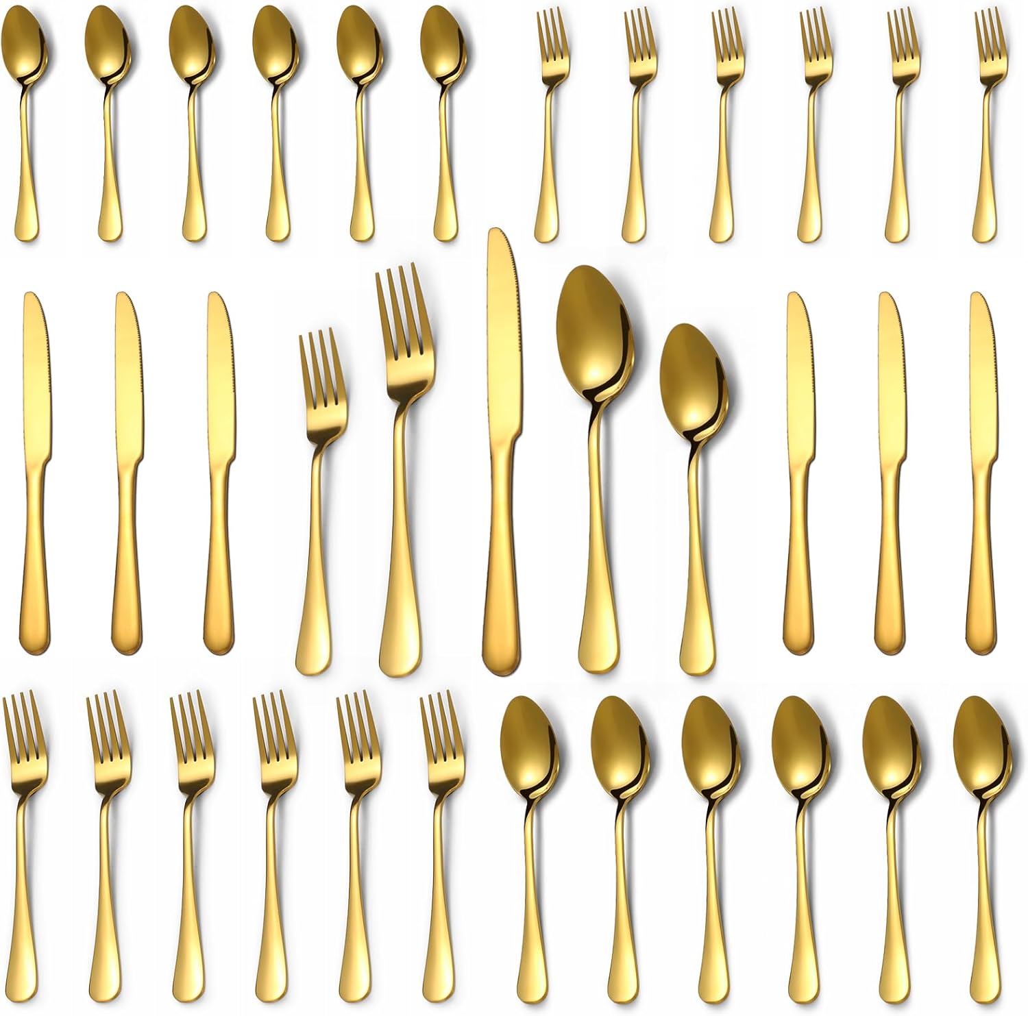 - ✅ 30 PIECE GOLD SILVERWARE SET, SERVICE FOR 6---This silver ware set contains: 6 dinner knives, 6 dinner forks, 6 salad forks, 6 dinner spoons and 6 teaspoons. Perfect gold stainless steel silverware for home, restaurant, family daily use, entertaining, wedding, outdoor dining, camping, dinner party, holiday usage and festival gathering. The silverware set gold color is elegant and shiny.