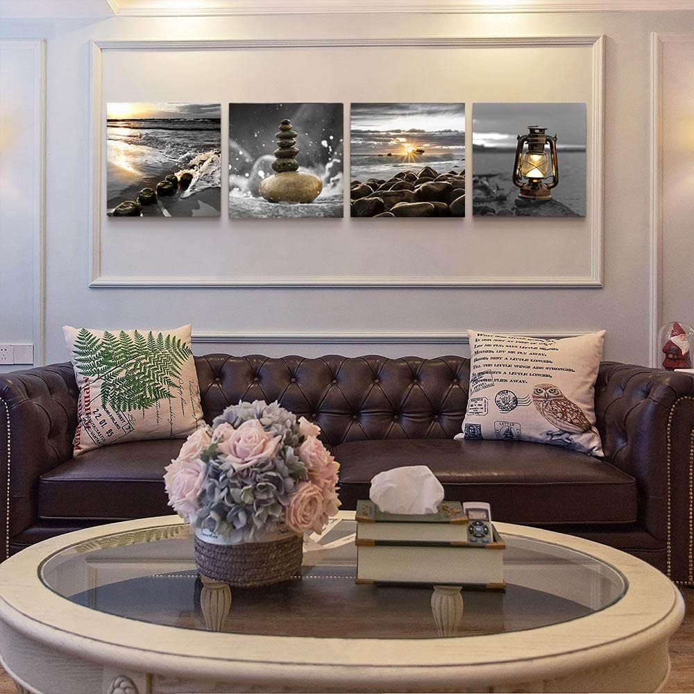 Yxbhhym-Canvas Zen Décor Black and White Beach Wall Art Ocean Poste Seascape Picture Print Sunset Scenery Painting Artwork for Living Room Wall Decor Bedroom Bathroom Wall Home Decorations Framed