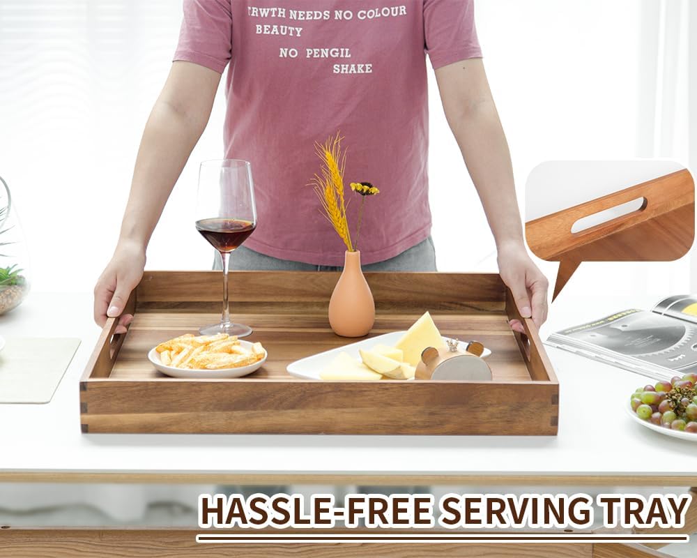 - 【EXTRA LARGE SQUARED WOOD TRAY】This giant wooden serving tray made from a sturdy acacia wood, durable, wipeable, food-safety, beautiful and functional. The big solid square-shaped tray is a good addition to your home.