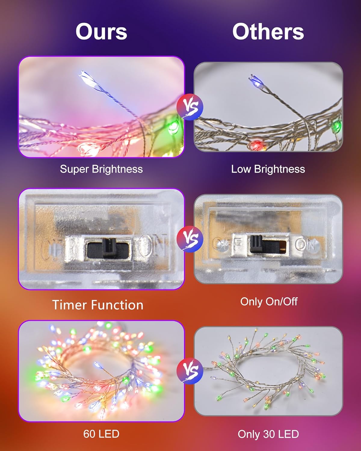 - Firefly Starry Lights: 60 super bright multicolor LEDs lights on 5 feet long wire with 1 inches distance between LED bulbs and 12 inches clear cable between wire and battery box, 6 hours timing lighting, steady on or steady on + timer mode optional