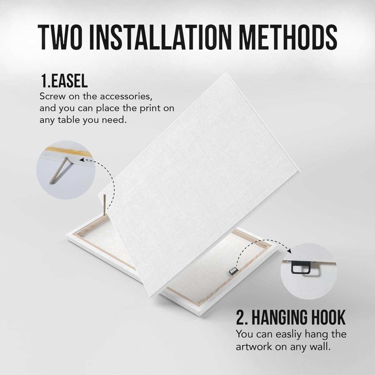 - Wall & Tabletop Decoration: Each modern wall art painting has hooks installed on the back, making it easy to hang anywhere you want to display it. In addition, there is a stand accessory. After simple installation, it can be placed on a flat surface such as a desktop or shelf.