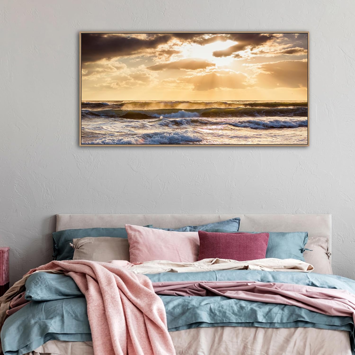 Framed Sunset Ocean Wall Art - Canvas Wall Decor Glow Sea Scene Nature Landscape Prints Sunset Over the Ocean Painting Artwork Living Room Bedroom Office Home 24" x 48"