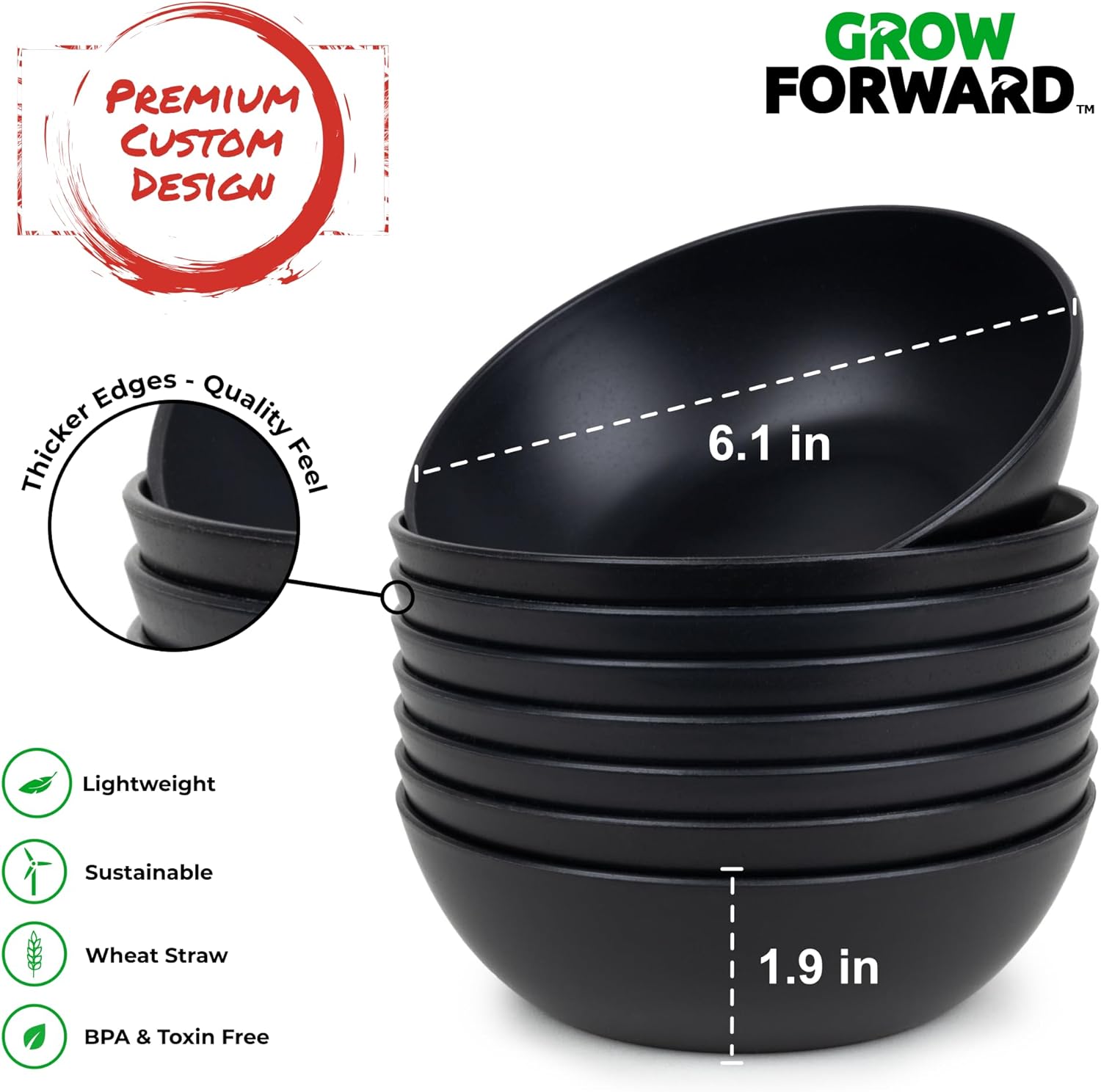 Grow Forward Premium Wheat Straw Bowls - 20oz Microwave Safe Plastic Cereal Bowls Set of 8 for Kitchen, Camping, RV, Dessert, Snack, Soup, Salad, Fruit - Reusable, Unbreakable & BPA Free - Midnight