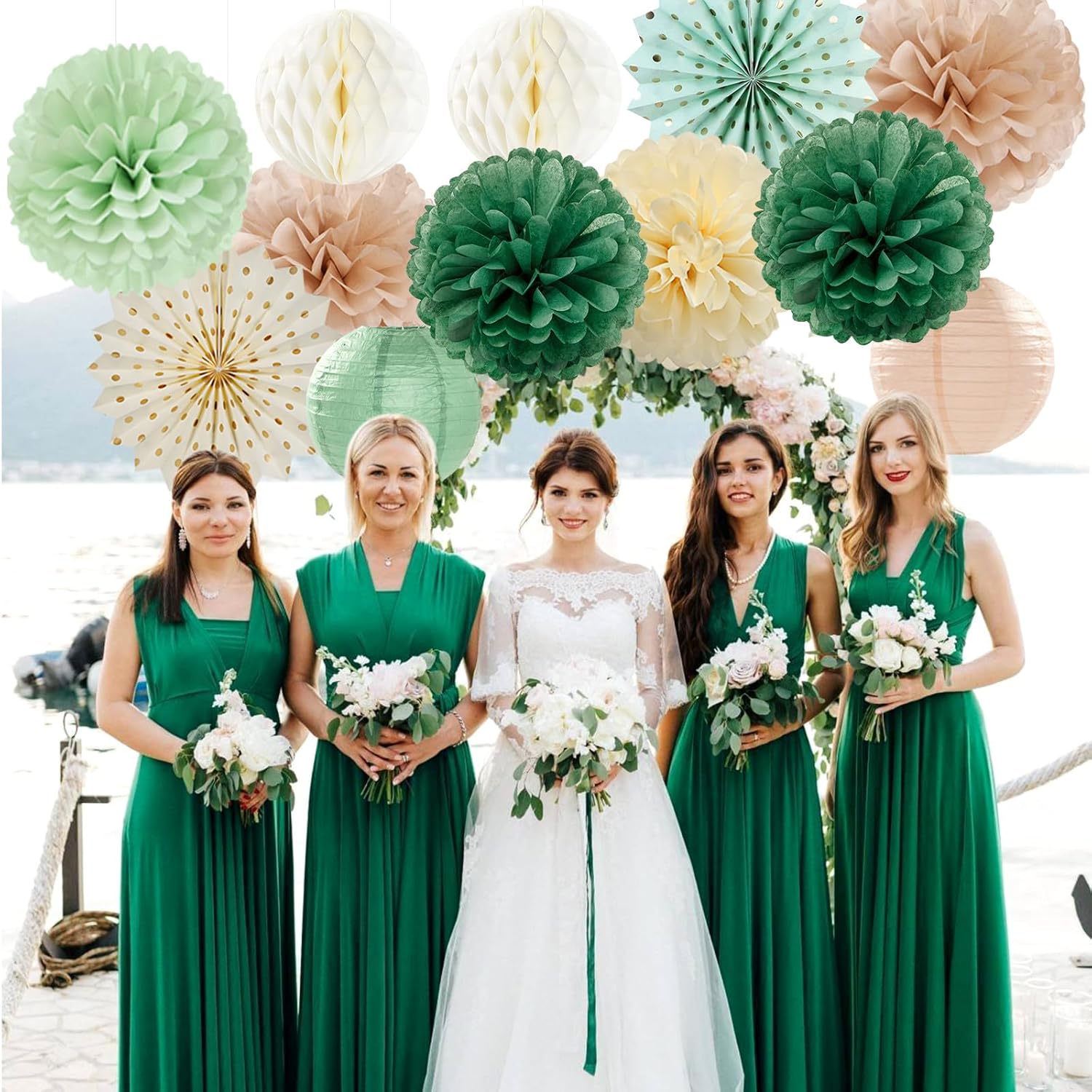 - 【Package Contains】The olive sage green beige champagne gold ivory party kits include 6pcs tissue paper flowers: 3pcs 10" and 3pcs 12" in three color, 2pcs 8inch paper honeycom ball,4pcs 8inch paper lantern, 2pcs 12inch paper fan.
