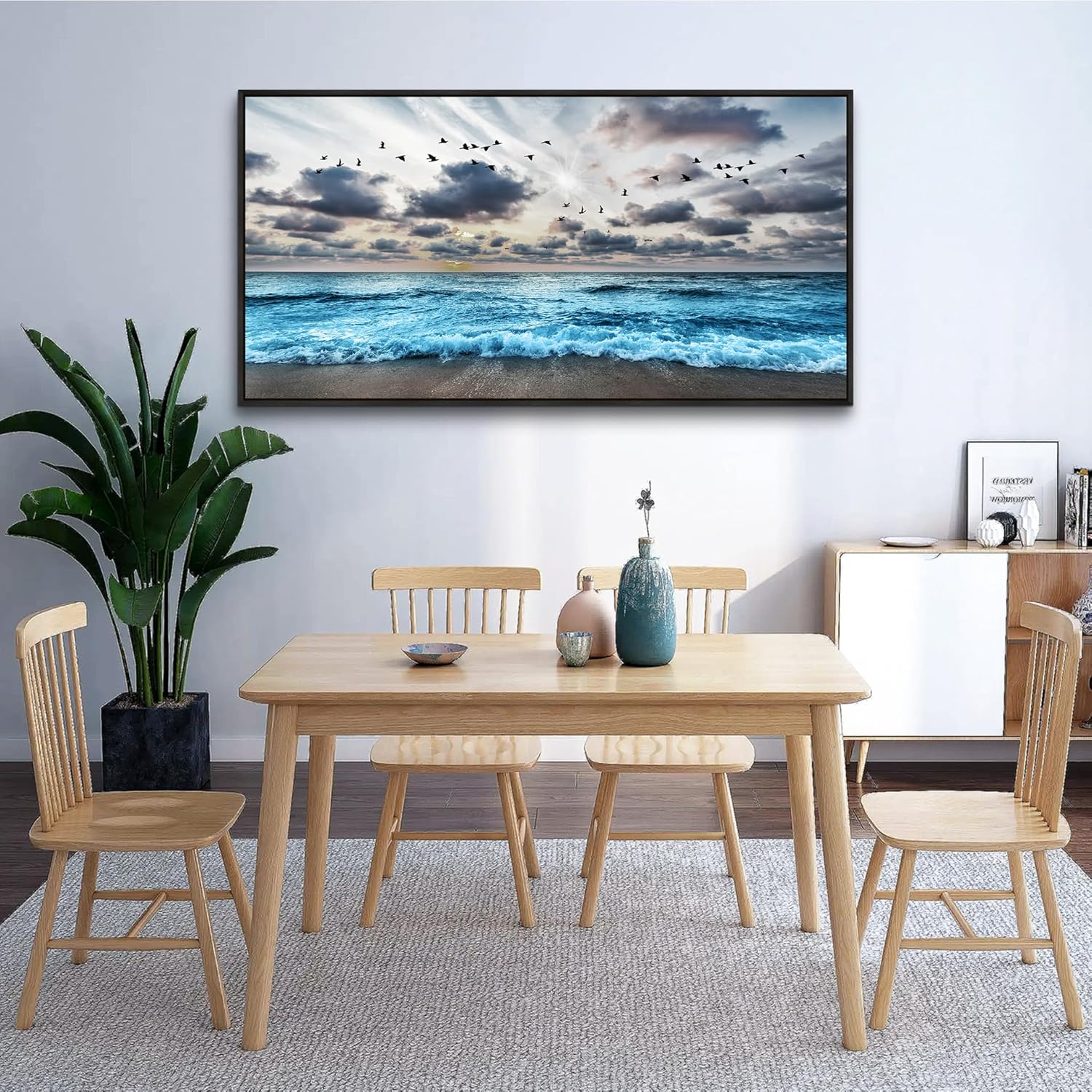 Wapluam Black And White Beach Wall Painting Black Framed Canvas Wall Art For Living Room Wall Decoration For Bedroom Office Wall Decor Blue Sea Wave Pictures Artwork Modern Hotel Room Home Wall Art