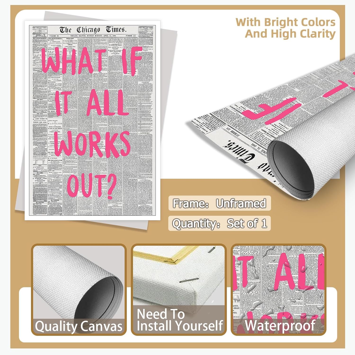 Liyark Retro Trendy Newspaper Canvas Wall Art - 'What If All Works Out' Positive Affirmation Quote - Pink Font - Minimalist Home Decor - 12x16in Unframed
