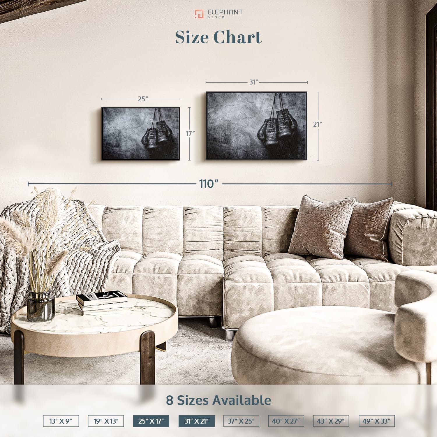 ElephantStock Boxing Gloves Wall Art - Horizontal Framed Canvas - 1-Piece Living Room Wall Decor - Photography Sports Canvas Print - Black and Gray Decor for Wall - 25" X 17"