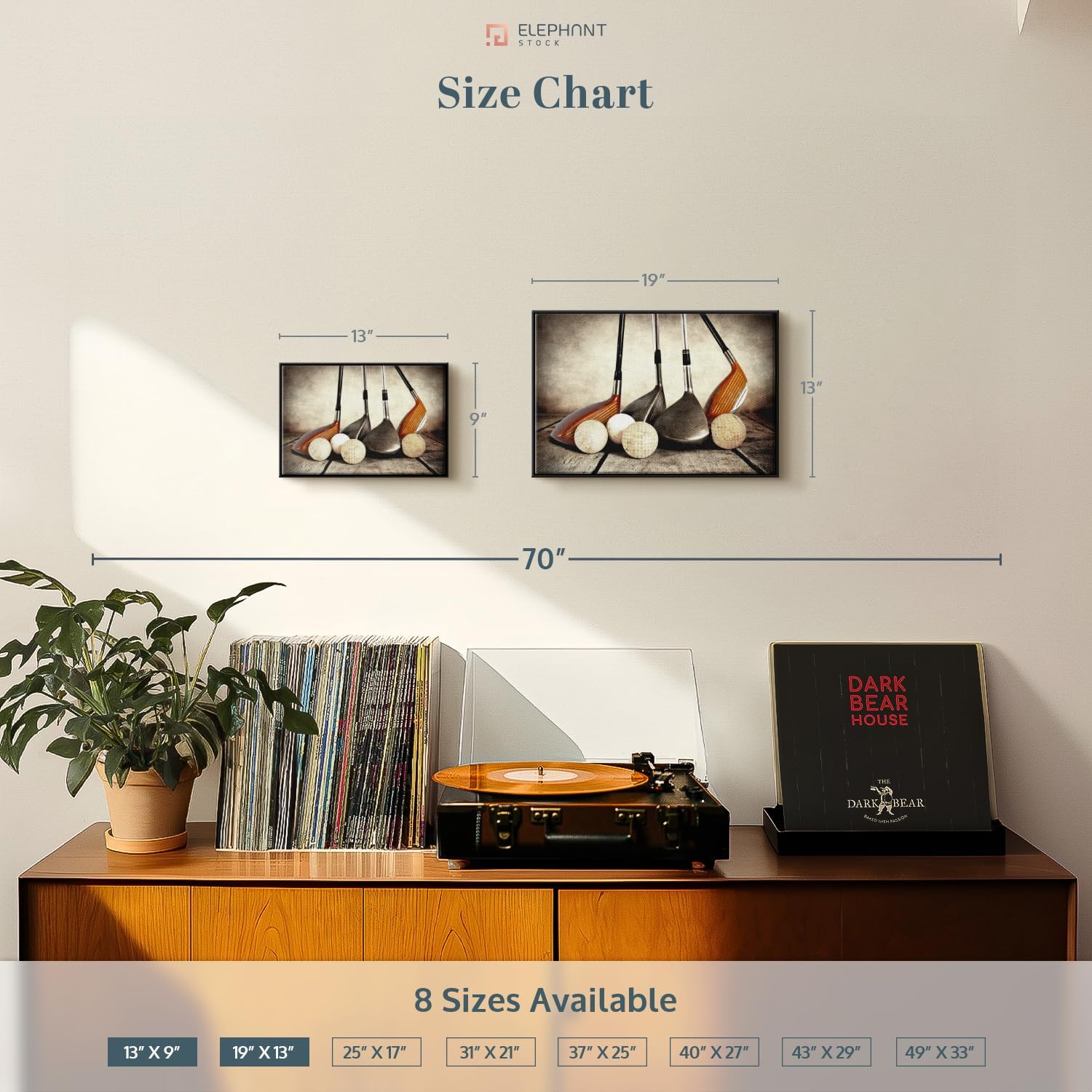 Elephant Stock Golf Sets Wall Art - Horizontal Framed Canvas - 1-Piece Mancave Wall Decor - Photography Sports Canvas Print - Yellow and Brown Decor for Wall - 19" X 13"