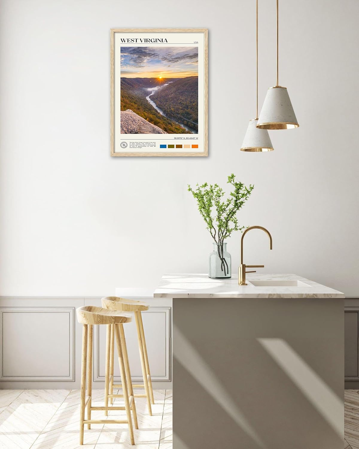 HesenDot Natural OAK Wood Framed West Virginia Wall Art,12x16in New River Gorge Quality Canvas Wall Print,Classic Urban Landmark Wall Decor for Living Room,Bedroom,Office Gallery Gifts Set of 1