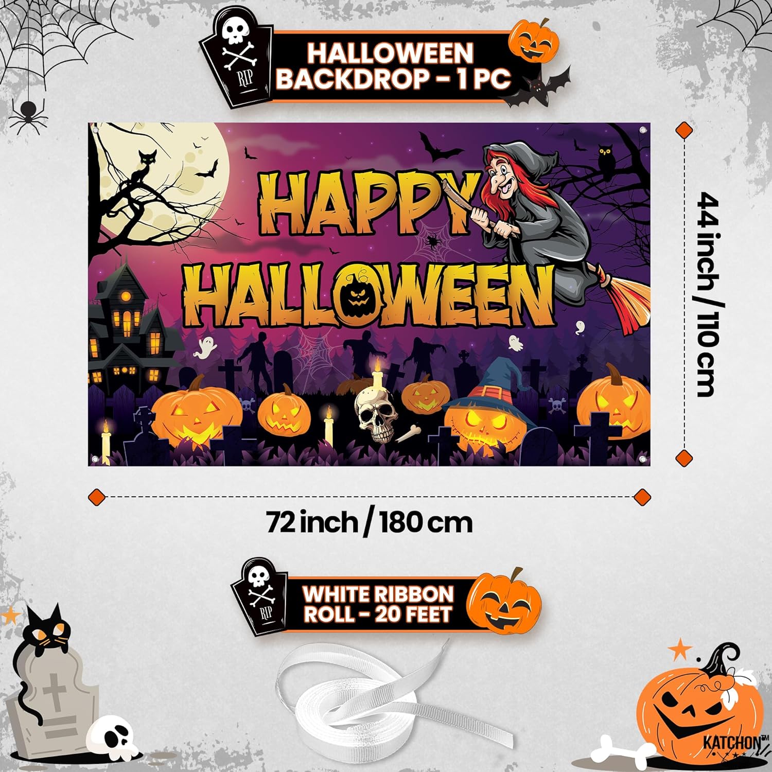 KatchOn Spooky Happy Halloween Banner - XtraLarge, 72x44 Inch | Pumpkin Halloween Backdrop for Purple & Orange Decorations | Witch Backdrop for Party Decorations