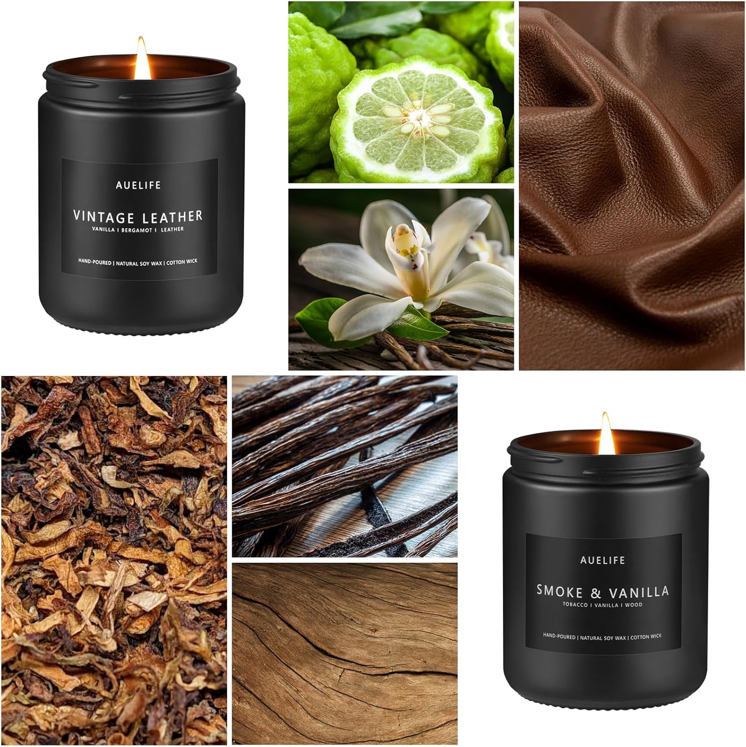 - ăVintage Leather Candleă: Rich vintage leather scent, with a sweet and warm aroma of vanilla. Combining these two flavors, the candle has both a strong leather feel and a soothing and warm feeling of vanilla. Leather candles bring you a complex and layered aroma experience.