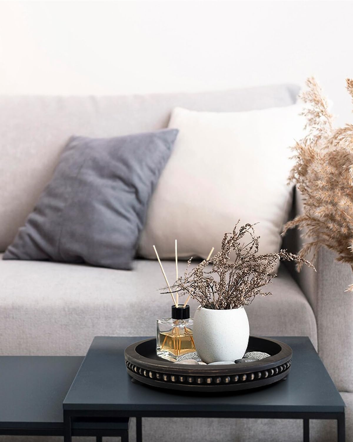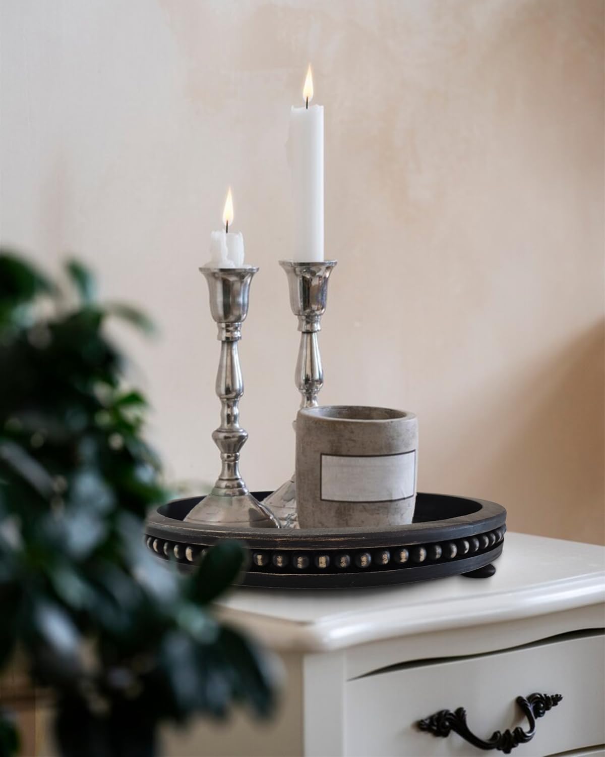 12 Inches Rustic Wooden Decorative Tray, Small Round Beaded Wood Tray for Kitchen Dinning Table Centerpiece Decor Entryway Living Room Home Decor, Black