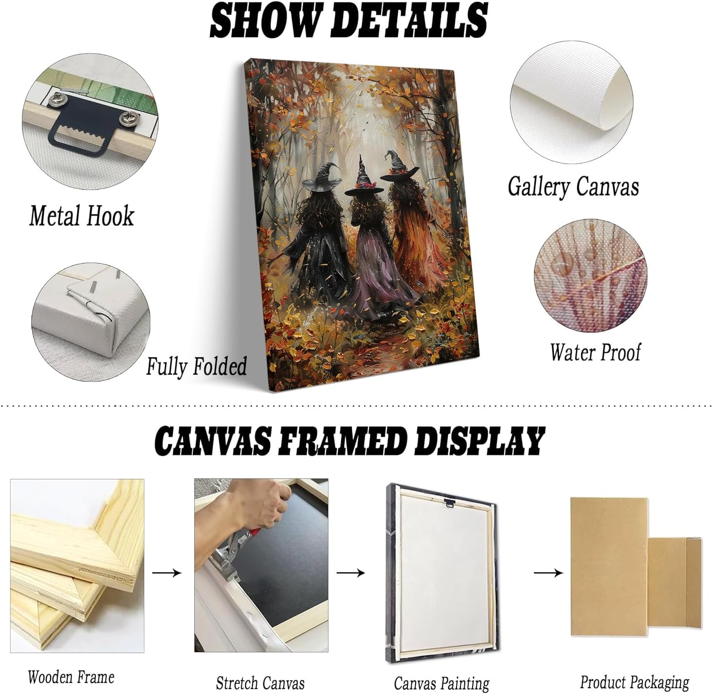 - Easy To Hang:Retro Halloween Print Frame wall art Poster size:12*16inchs. Whimsical ghost art already stretched on solid wooden frames, gallery wrapped, with hooks and accessories, ready to hang. The painting can be easily hung in any room you like and is very convenient. This unique print captures the essence of classicwitchcraft and Gothic,adding an eerie touch to any space.