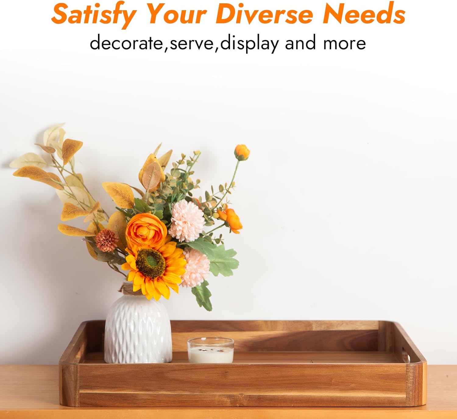 - 【Superior Wood Serving Tray】Made of natural acacia wood of high quality,lightweight but durable enough for serving food.The built-in handles makes the transporting foods and drinks safely and securely.