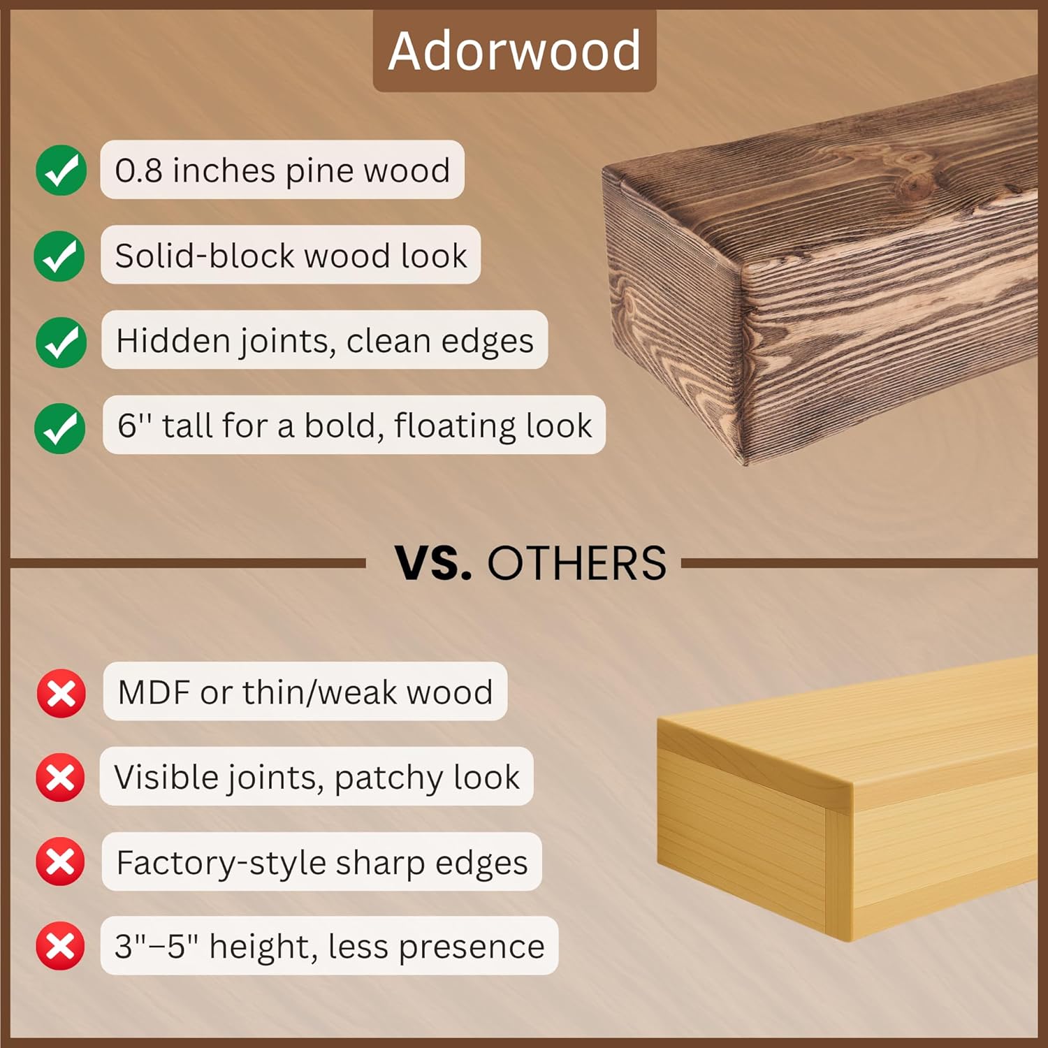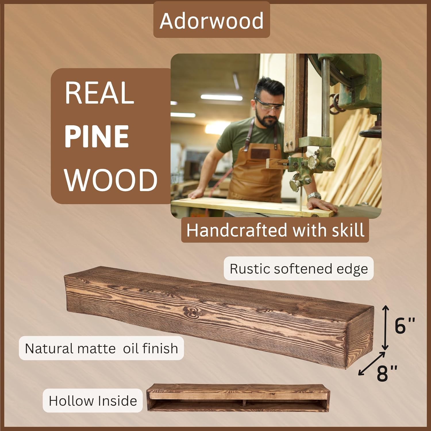 - GENUINE PINE WOOD TEXTURE: Each piece reveals natural knots, small cracks, and unique distressing, ensuring every mantel is one-of-a-kind. Due to the inherent characteristics of real wood, the grain and color may slightly differ from the samples shown.
