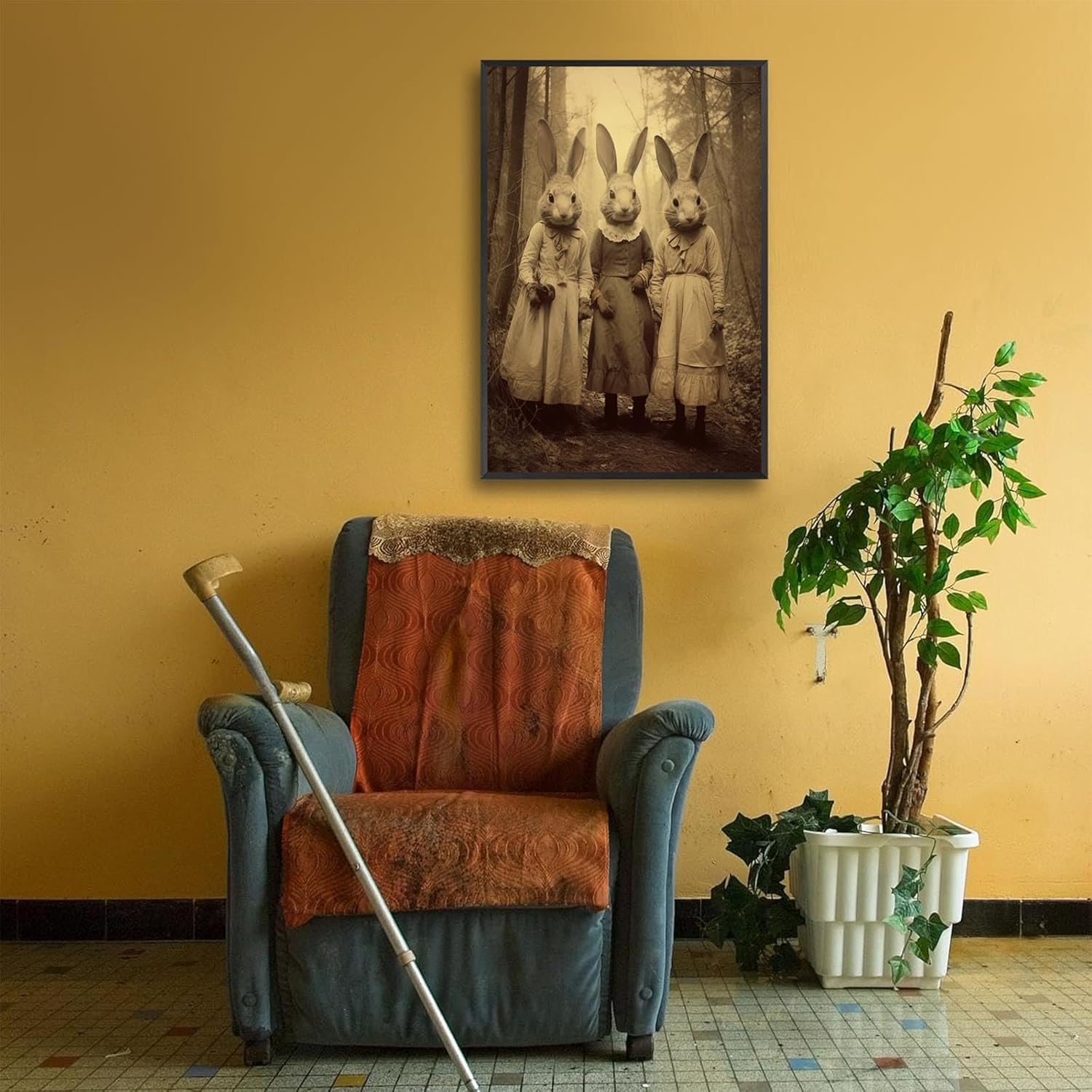 Vintage Horror Spooky Three Rabbits In Occult Forest Spooky Canvas Wall Art Poster Gothic Dark Academia Decorations Room Creepy Print Retro Halloween Wall Decor 16X24inch Aluminum Framed