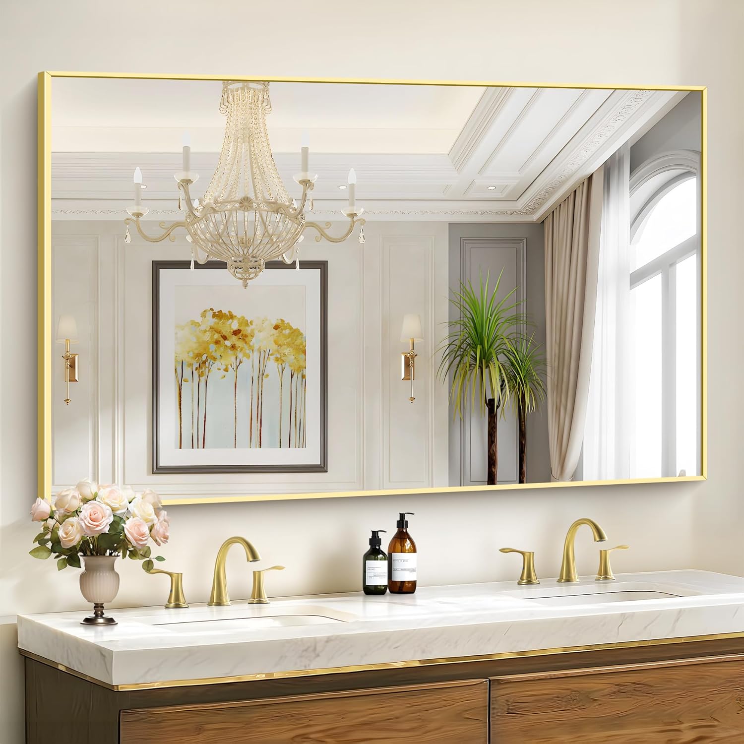 - DURABLE FRAME: Bathroom wall mirror frame is aluminum alloy frame,with good moisture resistance,anti-corrosion and sturdy. Gold classic color will provide your room with unique decoration to help you modernize room.