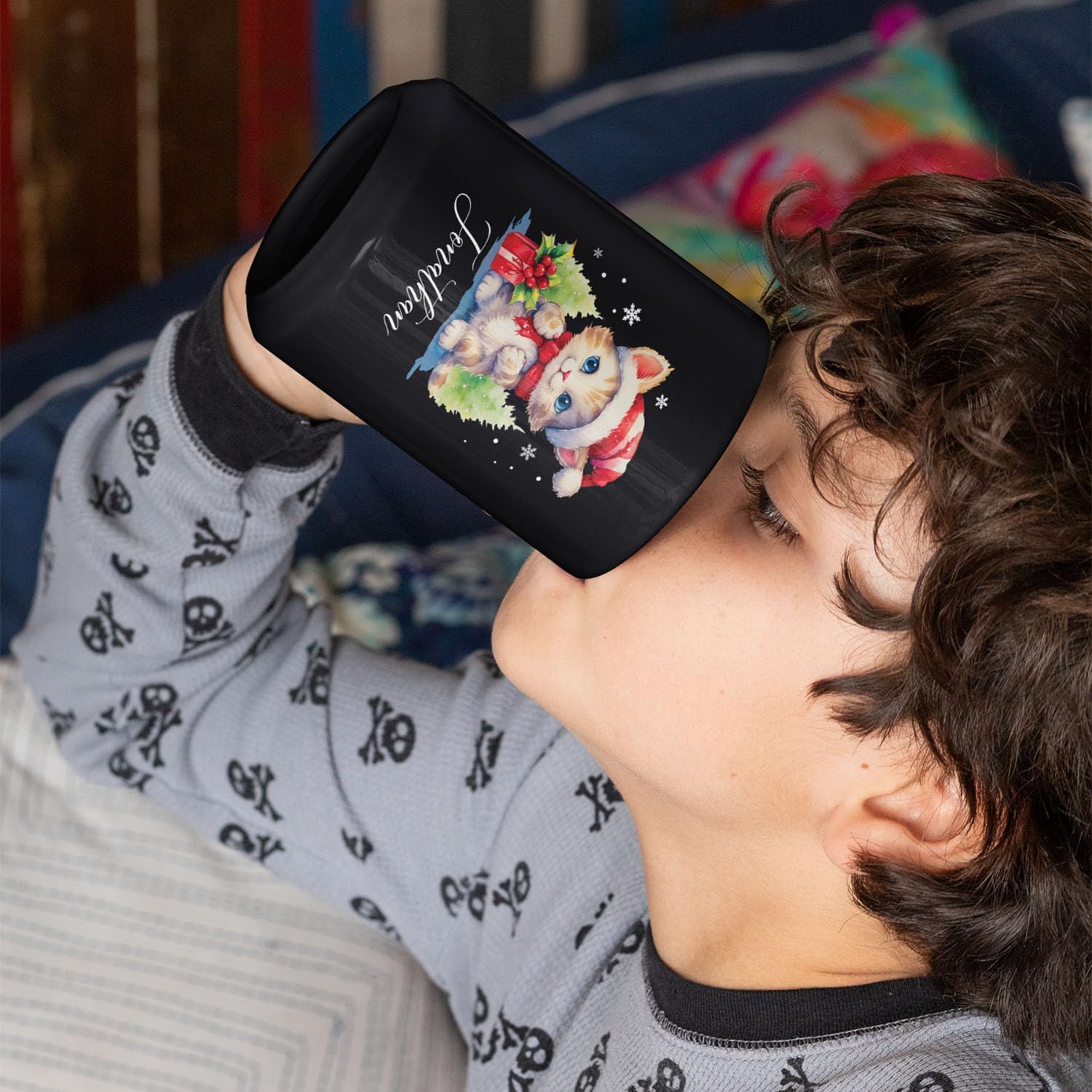 - 💝 UNIQUE DESIGN MUG: Delight a cat lover with this "Cute Christmas Cat Cup" featuring an adorable cat in a Santa hat surrounded by festive trees and a gift. Click "Customize Now" to add a name, making it a charming holiday gift for friends and family. This black ceramic mug is great for enjoying warm beverages during the Christmas season.