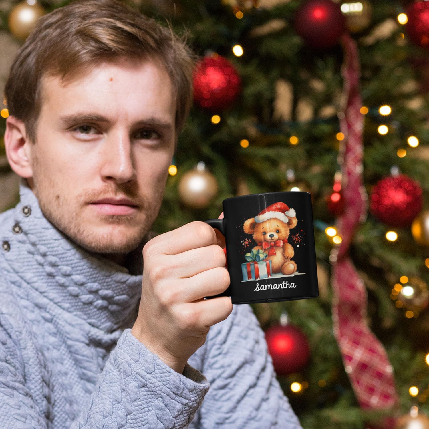 - 💝 UNIQUE DESIGN MUG: Spread holiday cheer with this "Custom Name Xmas Teddy Bear Cup" featuring a cute teddy bear in a Santa hat beside a festive gift. Click "Customize Now" to add a name, making it a personalized gift for the holiday season. This black ceramic mug is ideal for enjoying warm winter drinks in a cozy setting.