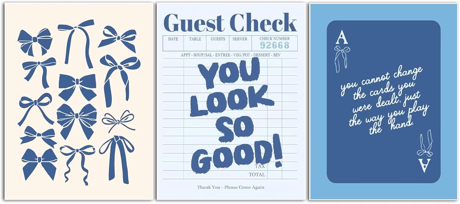 - Navy Blue Preppy Wall Art: This Blue Preppy Wall Art set includes three posters featuring navy blue bows, retro guest check designs, and minimalist poker cards, the fun, vibrant colors and designs make it ideal for enhancing any coquette room decor.perfect for adding a trendy aesthetic to your space.