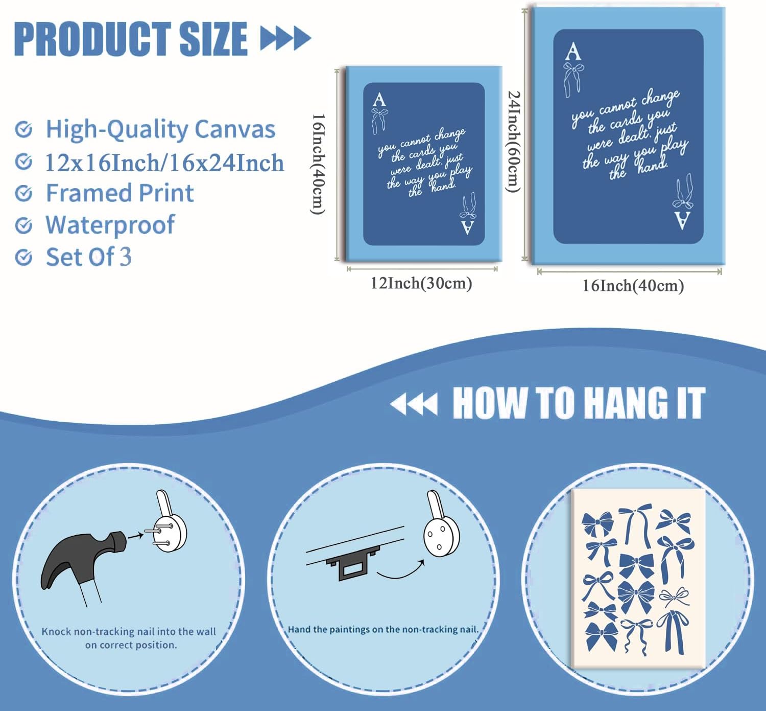 - Navy Blue Preppy Wall Art: This Blue Preppy Wall Art set includes three posters featuring navy blue bows, retro guest check designs, and minimalist poker cards, the fun, vibrant colors and designs make it ideal for enhancing any coquette room decor.perfect for adding a trendy aesthetic to your space.