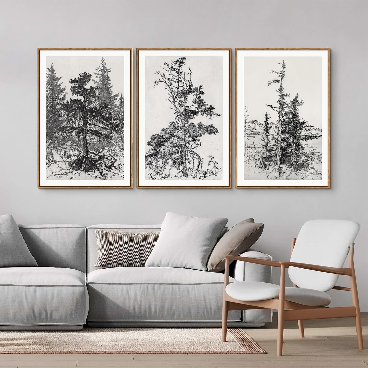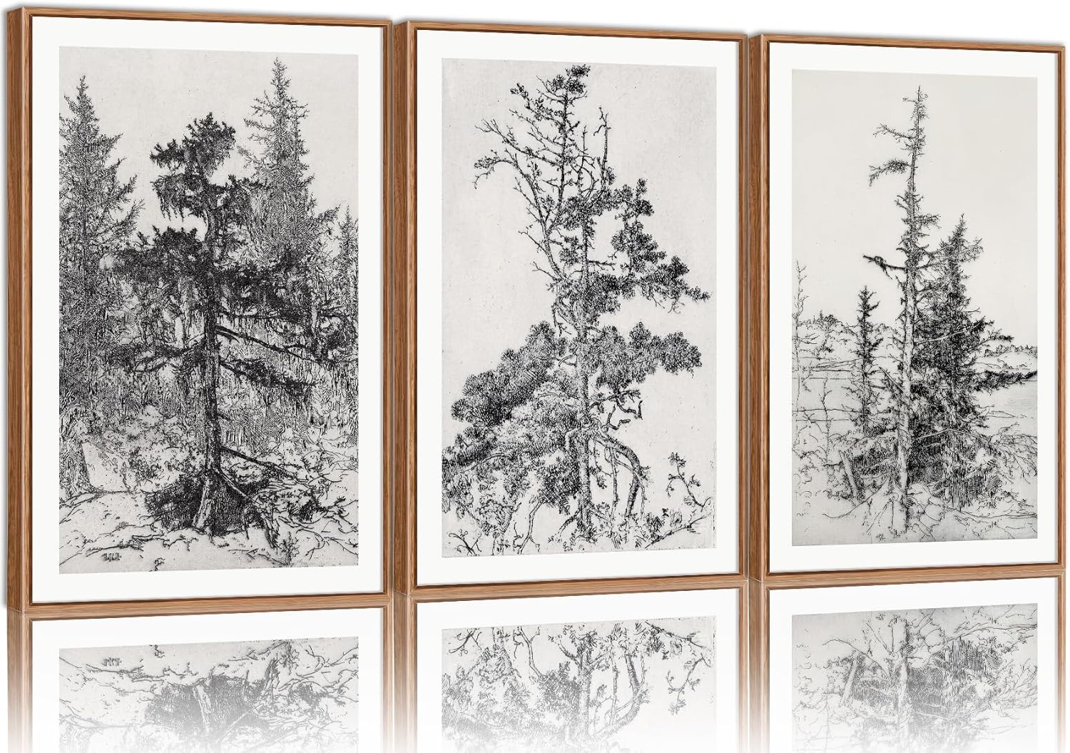 SIGNINART Vintage Tree Framed Wall Art Set , Black and White Antique Sketchbook Forest Painting, Wilderness Illustration Art Print , Retro Pine Tree Landscape Drawing Wall Decor for Living Room, Bedroom, Office (16"x24"x3)