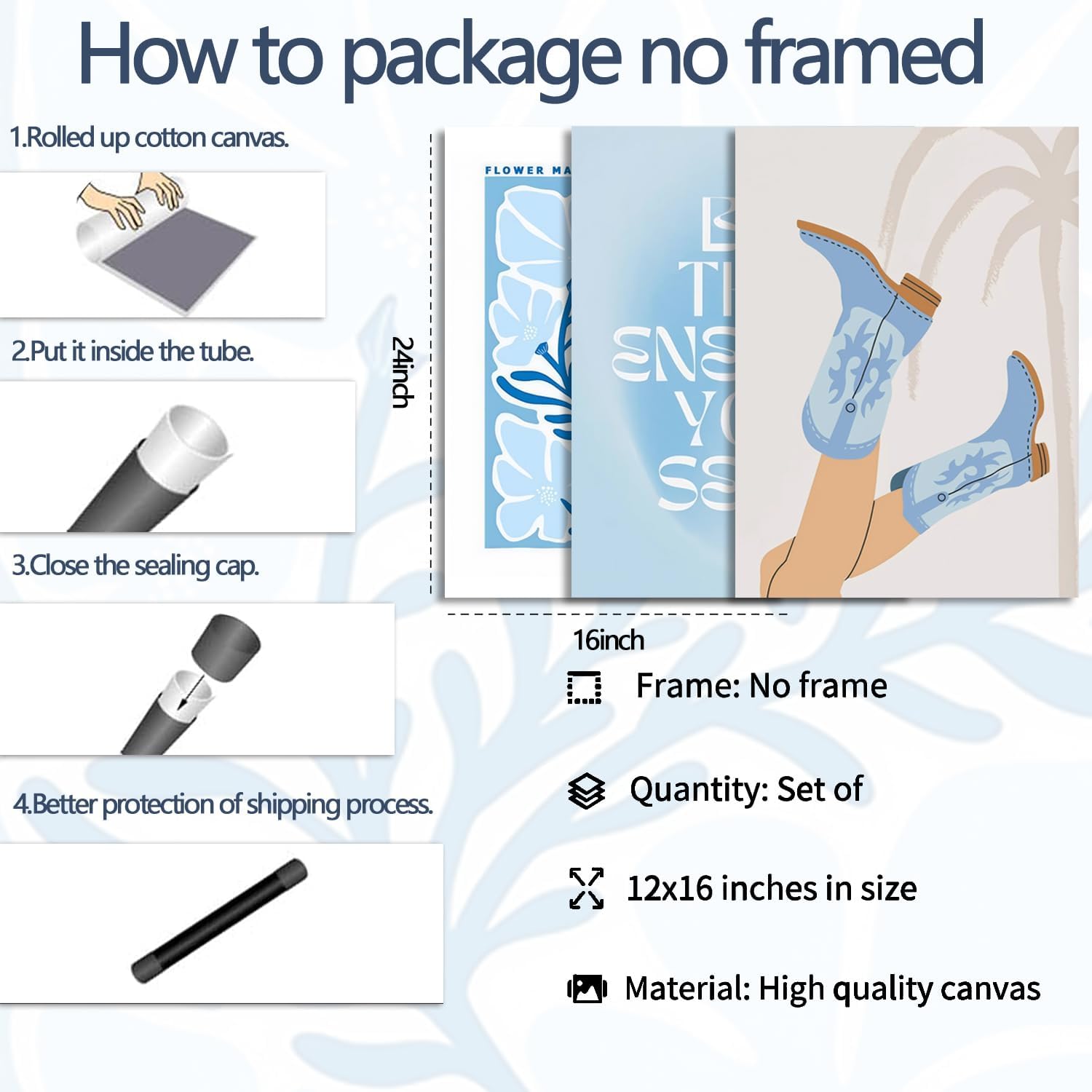 Blue Preppy Canvas Wall Art Posters Set of 3 Trendy Cowgirl Boots Home Decor Flower Market Painting Prints Coastal Aesthetic Picture for Girls Bedroom Bathroom Living Room Dorm 16x24Inch Unframed