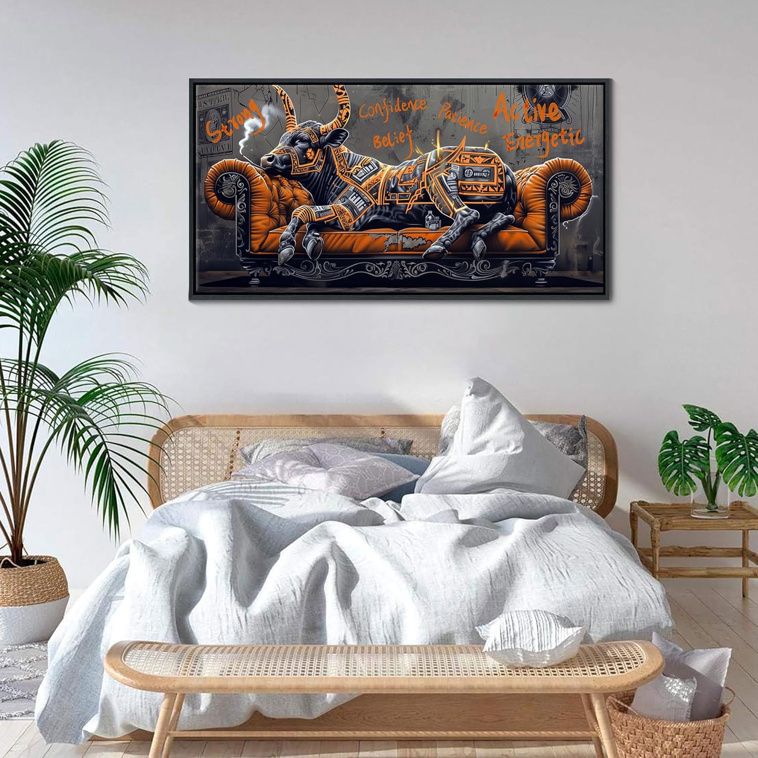 - Shocking images: This canvas wall art Show a strong bull lying on a sofa in a different scene.