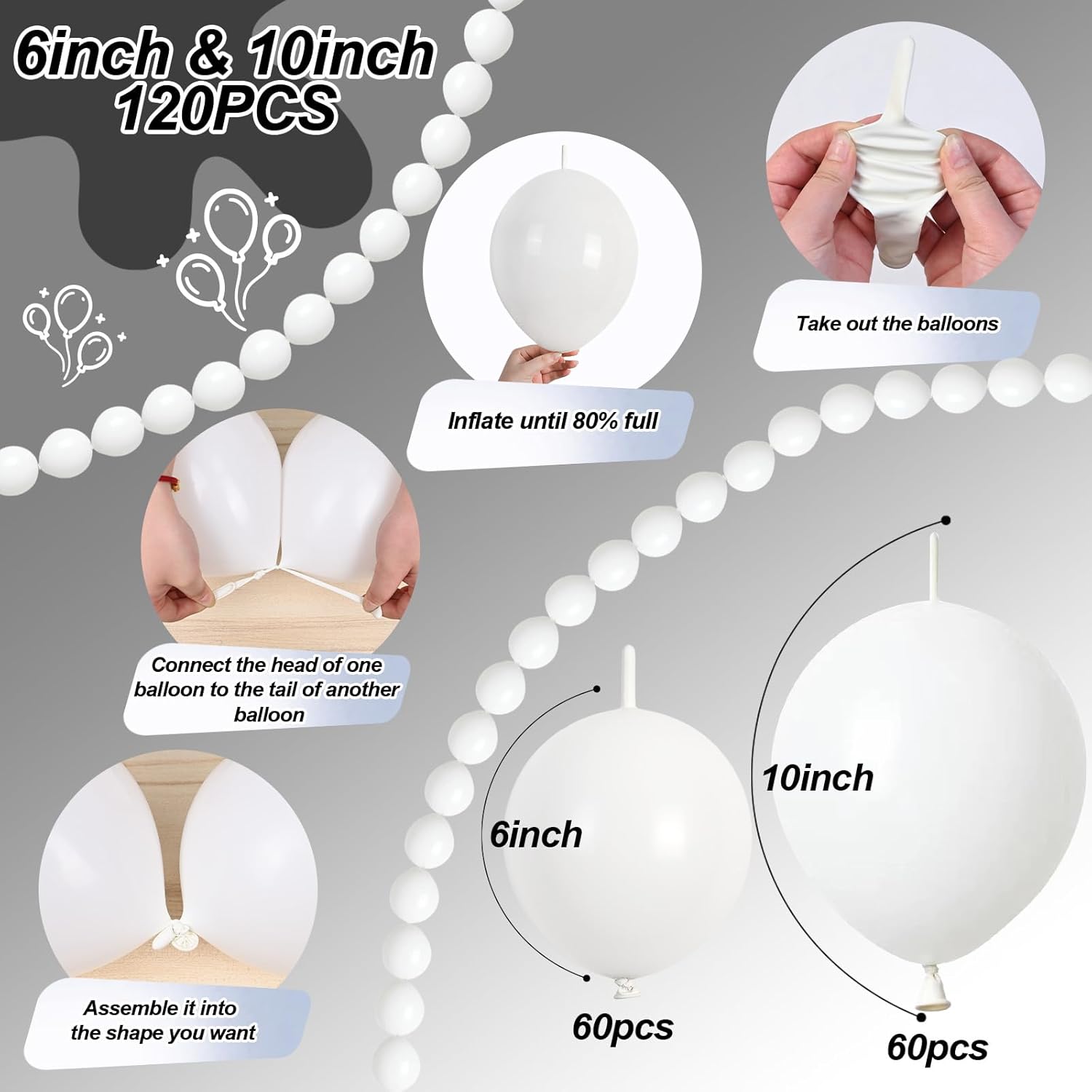 - 💫Balloon Chain Garland - You will receive 120 pcs white link balloons, include 10inch*60pcs + 6inch*60pcs. Our quick link balloons have a unique tail design that allows balloons link to be easily. More convenient and easier to assemble than regular balloons.