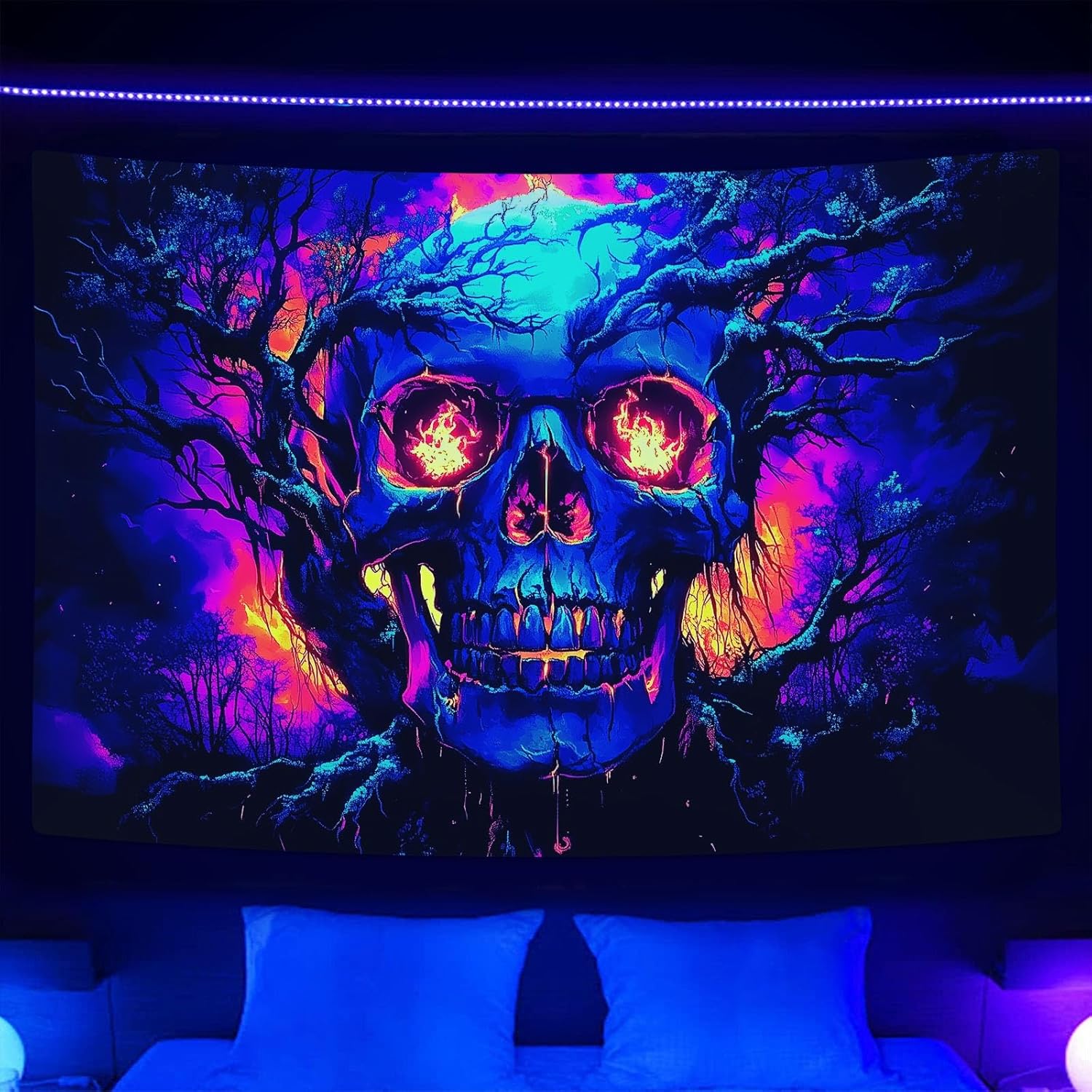 Xiaoput Blacklight Fire Skull Tapestry for Bedroom, Trippy UV Reactive Burning Skeleton Forest Wall Hanging Tapestries, Scary Dark Horror Glow in the Dark Tapestries for Living Room Home Dorm 80X60IN