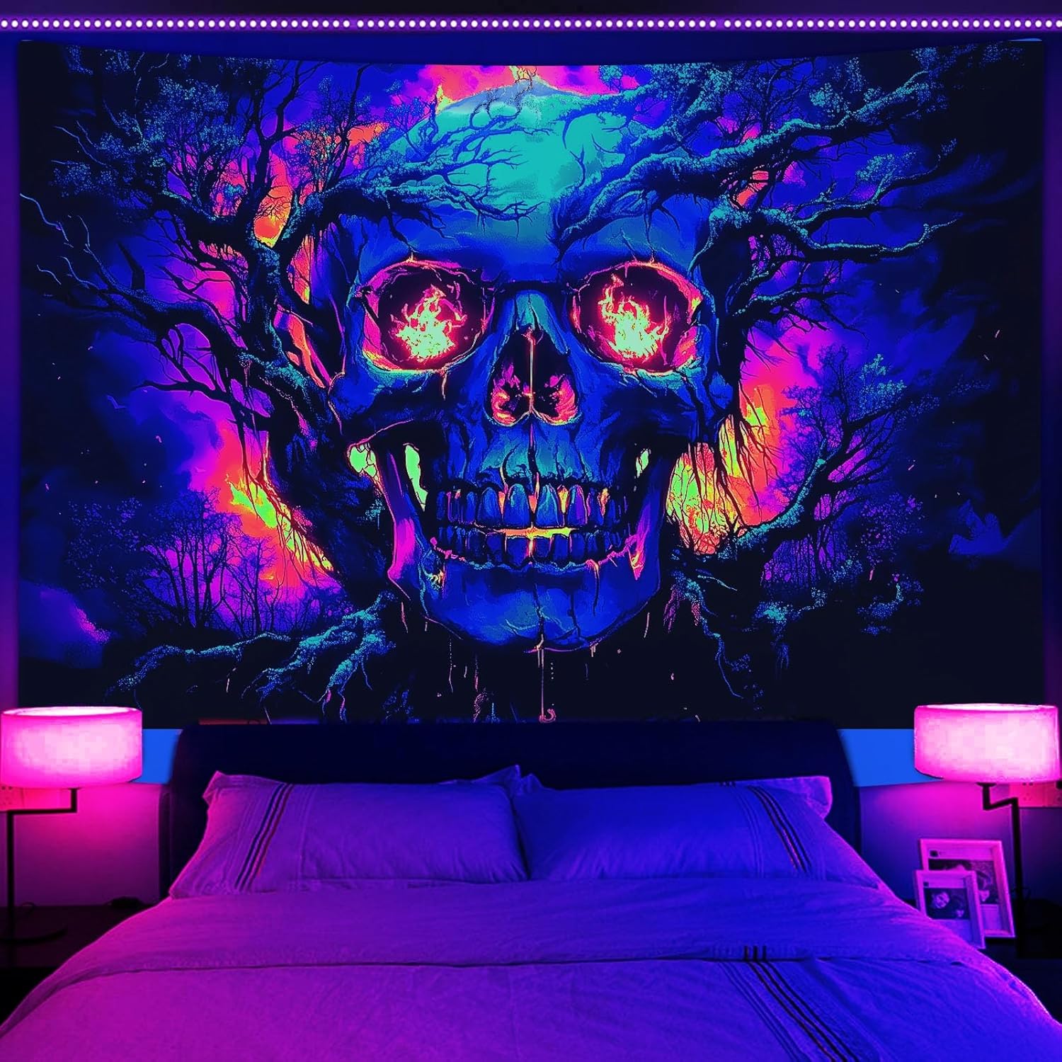 - UV Reactive & Glow in the Dark:This skull skeleton butterfly tapestry under normal lighting, the colors are full and vivid. Under blacklight / UV light, emit a dazzling dark light, creating a different visual experience.