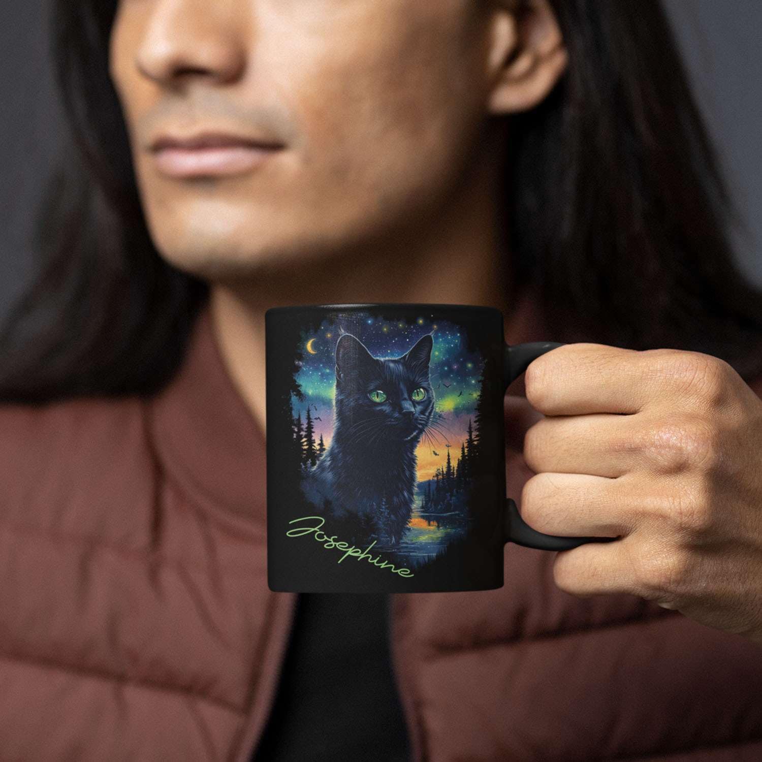 Custom Cute Cat Coffee Mug With Northern Lights, Customized Name Ceramic Mug 11oz 15oz, Beautiful Nature Scene Mug, Personalized Animal Lovers Black Cup, Gift For Pet Enthusiasts