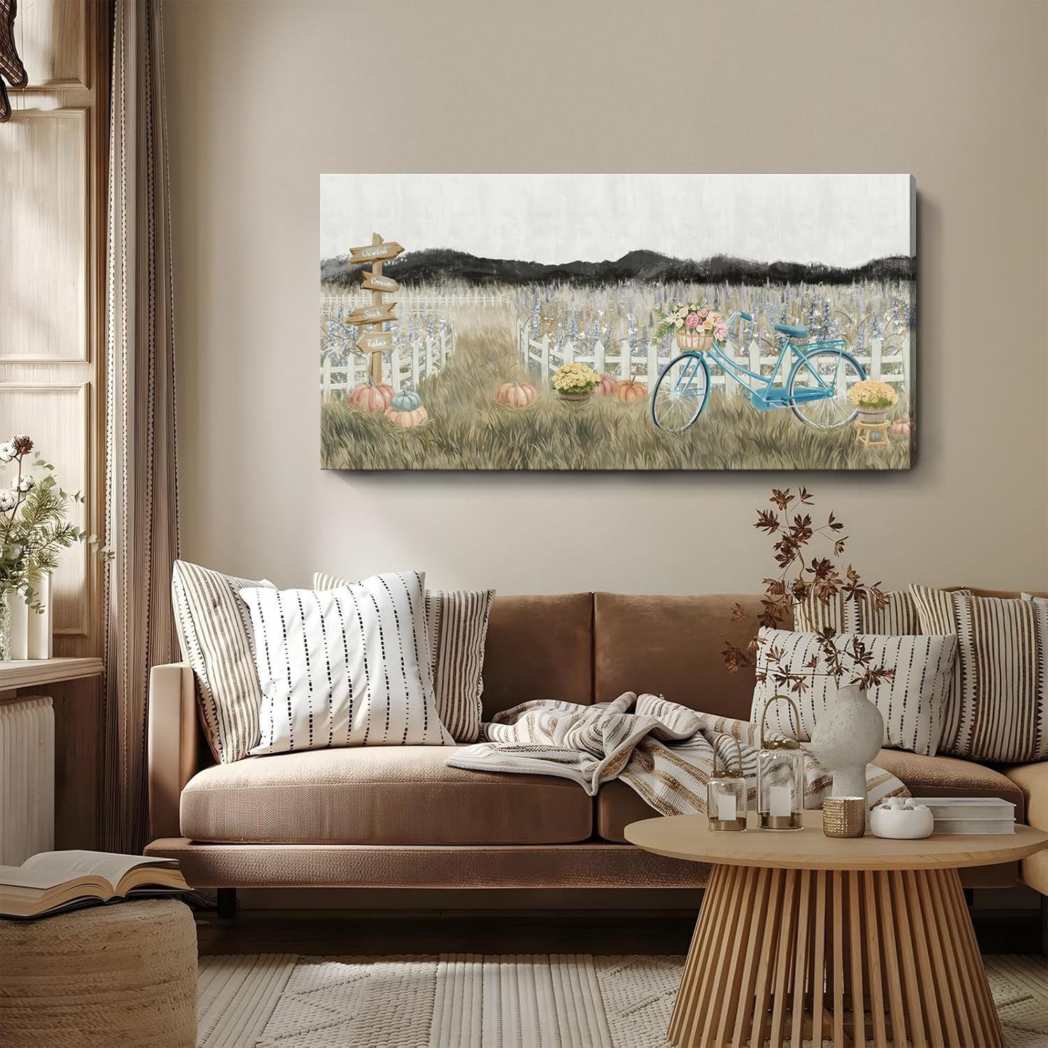- Versatile Modern Farmhouse Wall Decor. This large canvas wall art blends modern farmhouse style with vintage charm, featuring a blue bicycle, floral basket, pumpkins, and a rustic picket fence. With soft beige, taupe, and warm brown tones, it adds warmth and character to bedrooms, bathrooms, kitchens, and more—perfect for those who love neutral, earthy decor.