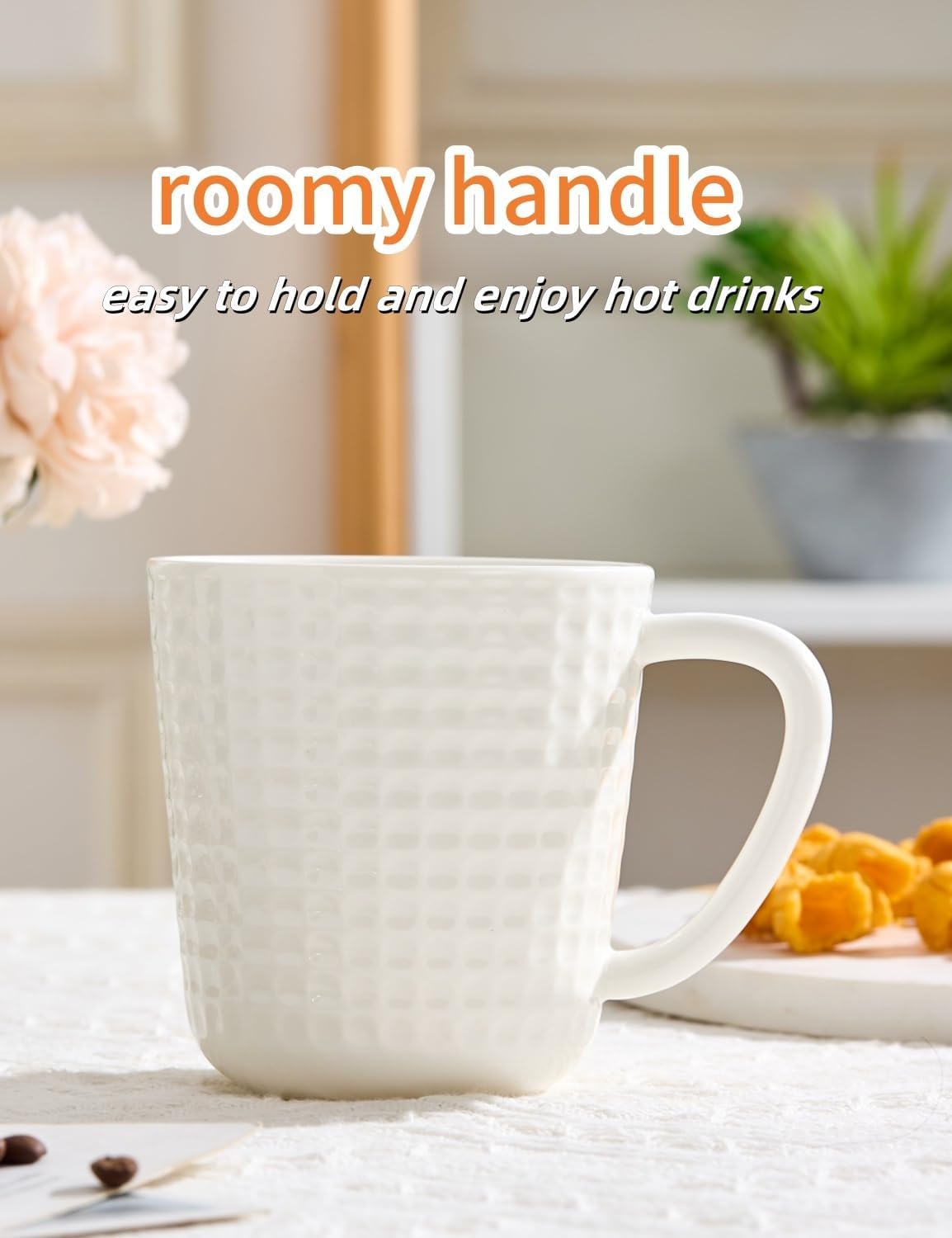 - Large Handle: The ergonomically designed handles provide a comfortable and secure grip.The spacious D-shaped handle ensures a secure and relaxed hold, making every sip a pleasure.These white coffee mugs are just the right weight to feel sturdy without being too